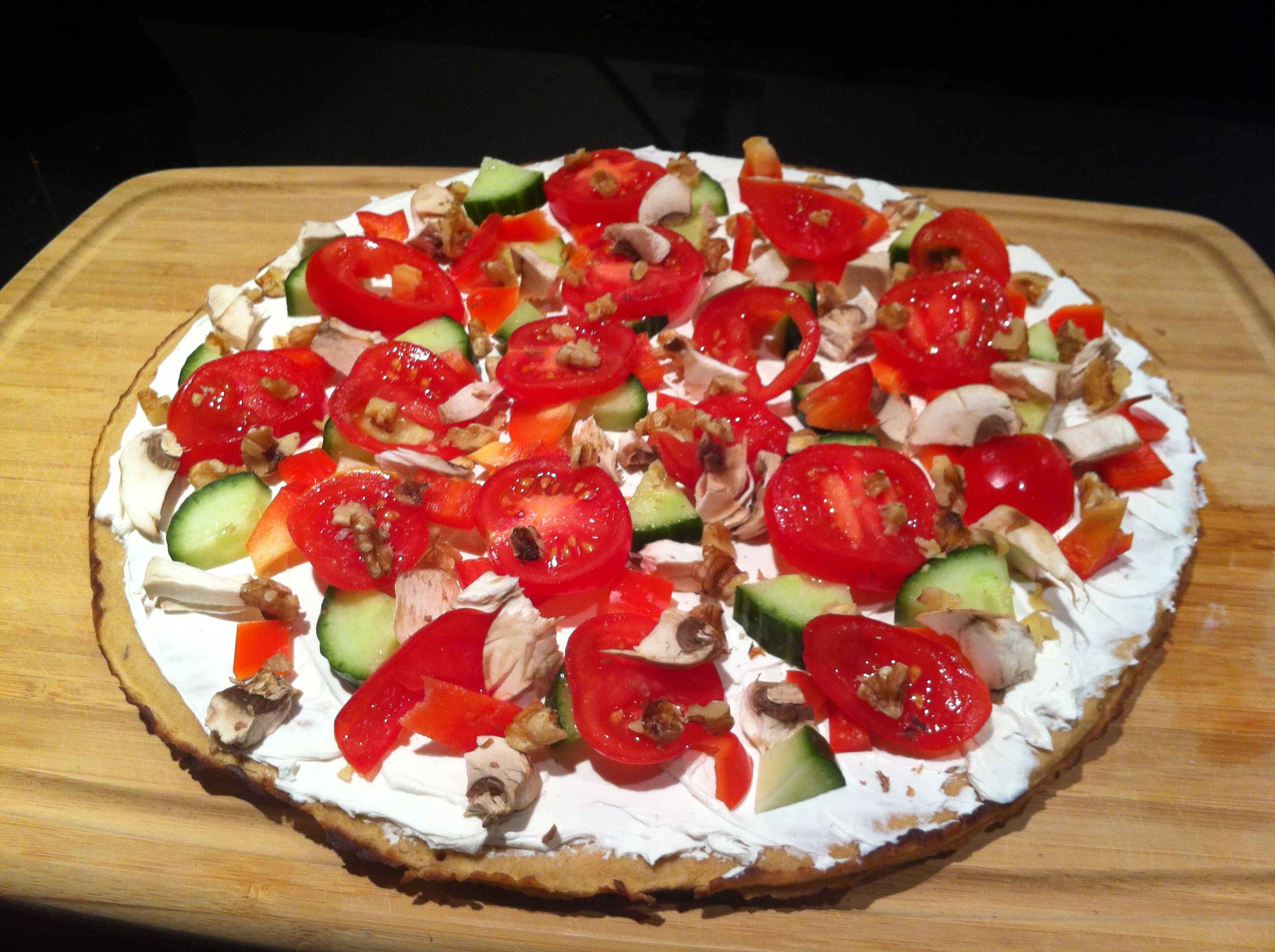 Start by stirring the cream cheese to soften. When spreadable, spread onto the pizza crust. Spread as thick or thin as you like. Next, layer the other topping to your liking. Cut just like you would any other pizza and enjoy.