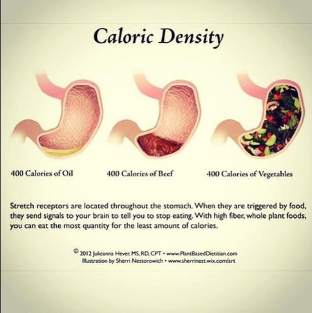 If desiring any additional reason to load up on vegetables, this illustration works. It clearly shows why eating junk food will not help a stomach feel as full. Even eating a large portion of animal protein will not help a stomach feel as full. Not feeling full encourages additional eating and thus weight gain.