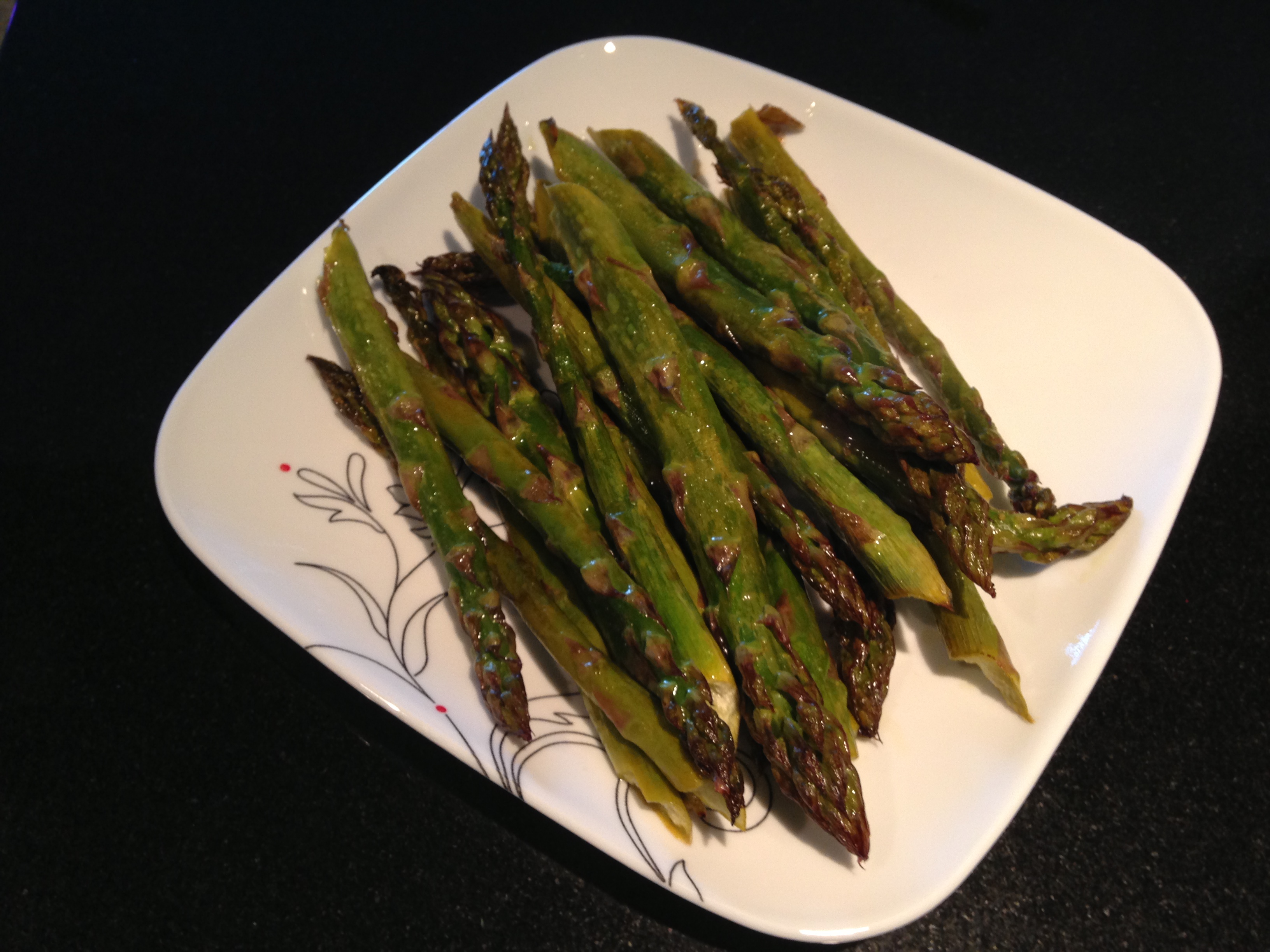 Pre-heat oven to 400 degrees. Rinse the asparagus and twist off the bottoms that will be hard to chew. Place asparagus into a large plastic bag that zips shut. Add the other ingredients, seal bag and mix everything well by shaking the bag. Pour everything into a large glass baking dish and place onto the middle shelf of oven. Bake 10 minutes and shake dish to make sure everything is getting evenly baked. Return pan to oven and bake another 10 minutes. Check asparagus that it is browning. If browning, remove pan and serve hot. If not browning yet, bake another 5 minutes and repeat this step until baked. Enjoy!