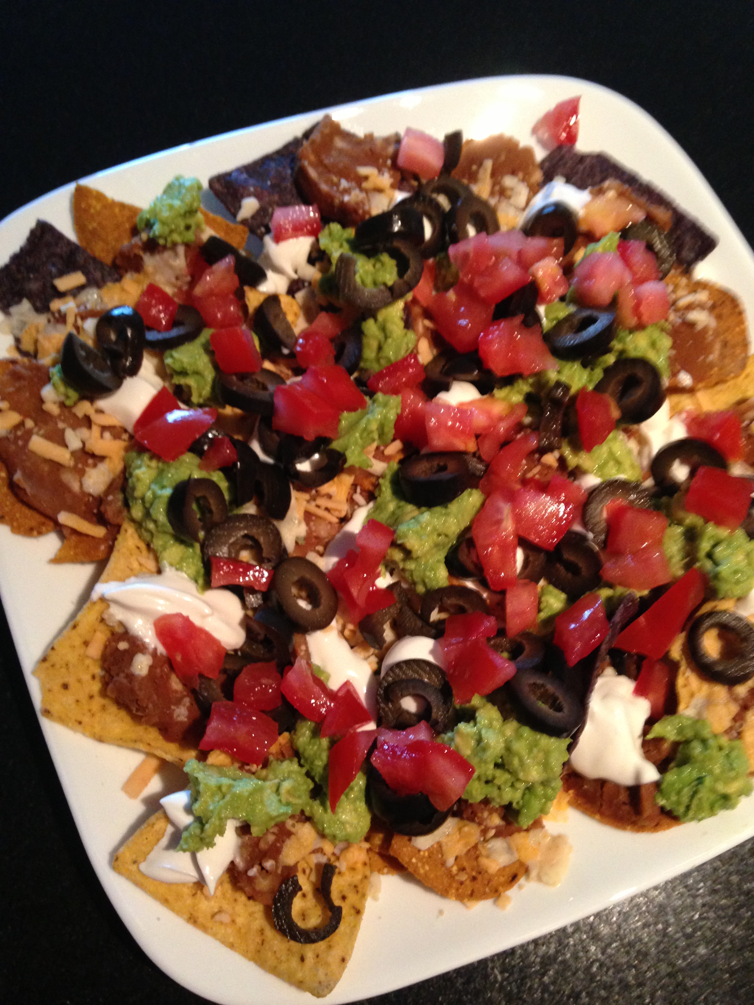 Mash the avocado with the lemon juice to make a simple guacamole. Place a glop of refried beans on every chip and arrange one layer on a plate. Layer with cheese and microwave until the cheese melts, about a minute. Randomly glop on guacamole and sour cream to your liking. Layer on tomatoes and olives. Enjoy!