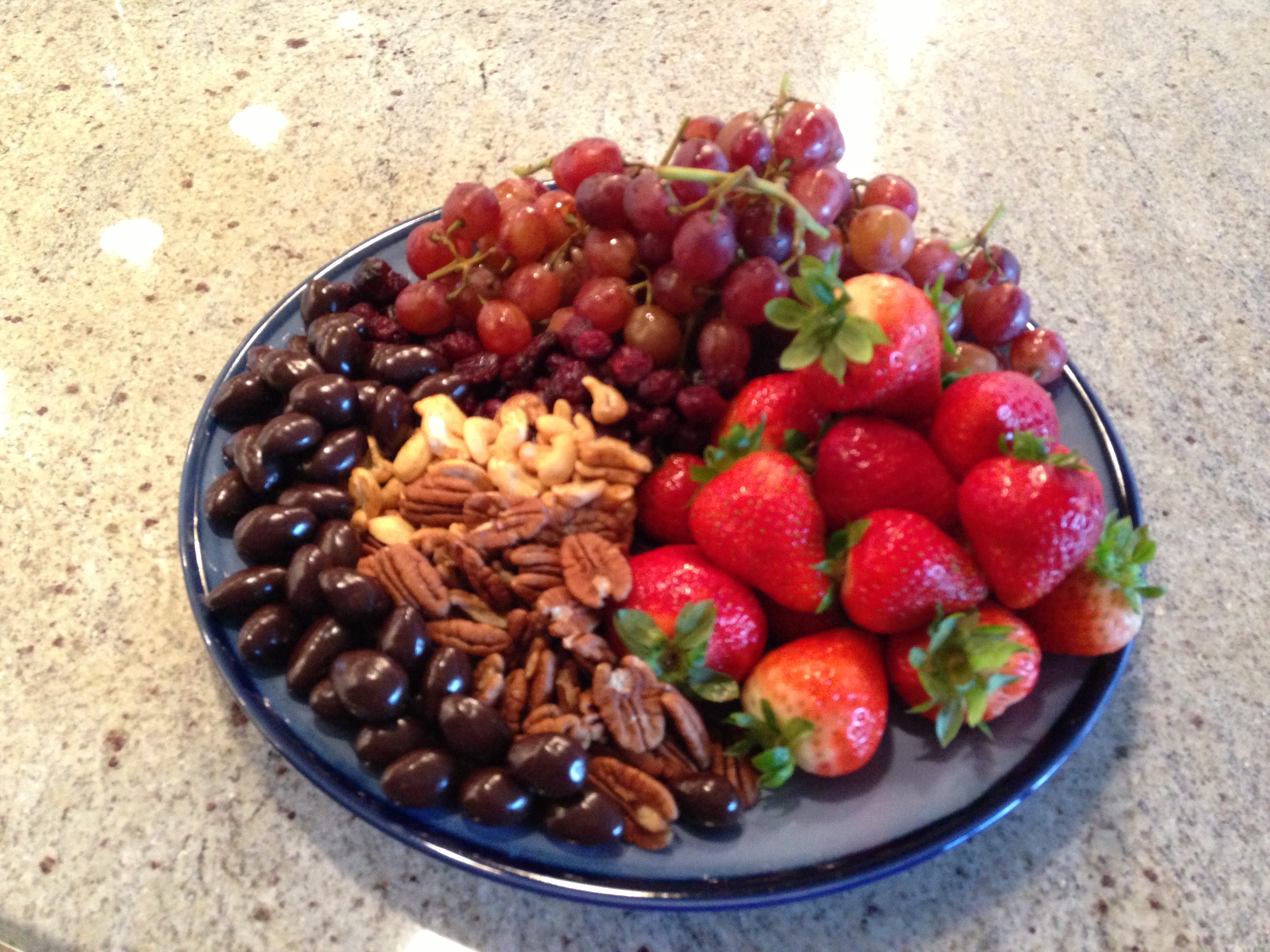 I came up with this solution and had very little to bring home with me. I thought, everyone likes fruit, but fruit trays don’t always do well. What if I present the fruit a little different and add some different yummy nuts? It worked great. I used fresh red grapes, cut the stems so that four to six grapes could be picked up at a time, beautiful fresh strawberries, and sweetened dehydrated cranberries. To these I added plain pecans and tamari cashews. Then, to add a little extra sweet, dark chocolate covered almonds. It was a big hit and I was less stressed.