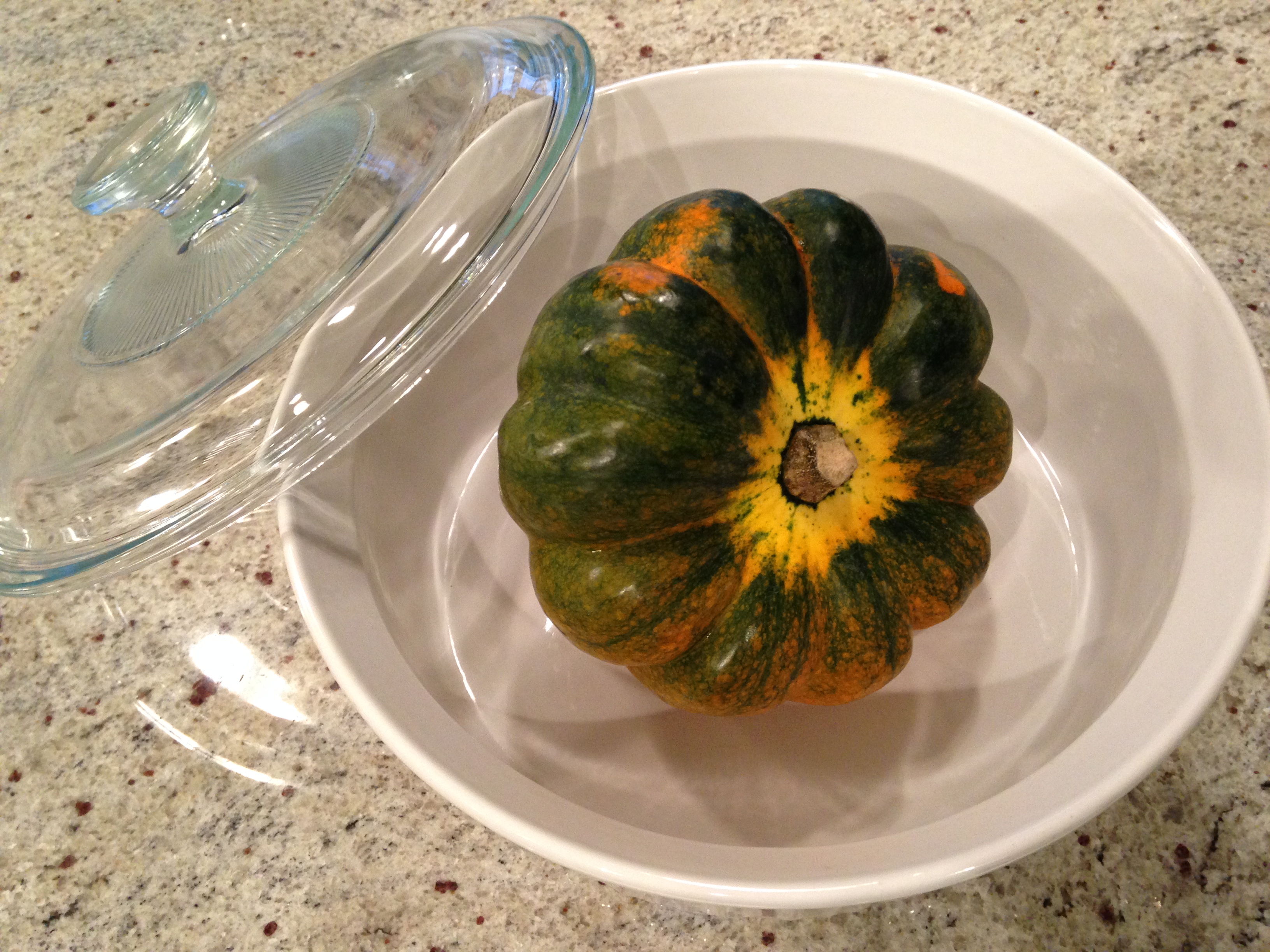Wash the outside of the squash. Place squash in a microwave safe dish with lid. Cook for 10 minutes. Using a pot holder, check that the squash is very soft to touch. If not, cook another two minutes check again, repeat until soft. Once soft, let cool a few minutes and use a large knife to cut open for faster cooling. When ready, scoop out seeds and serve. Yummy! Oh, so much easier!