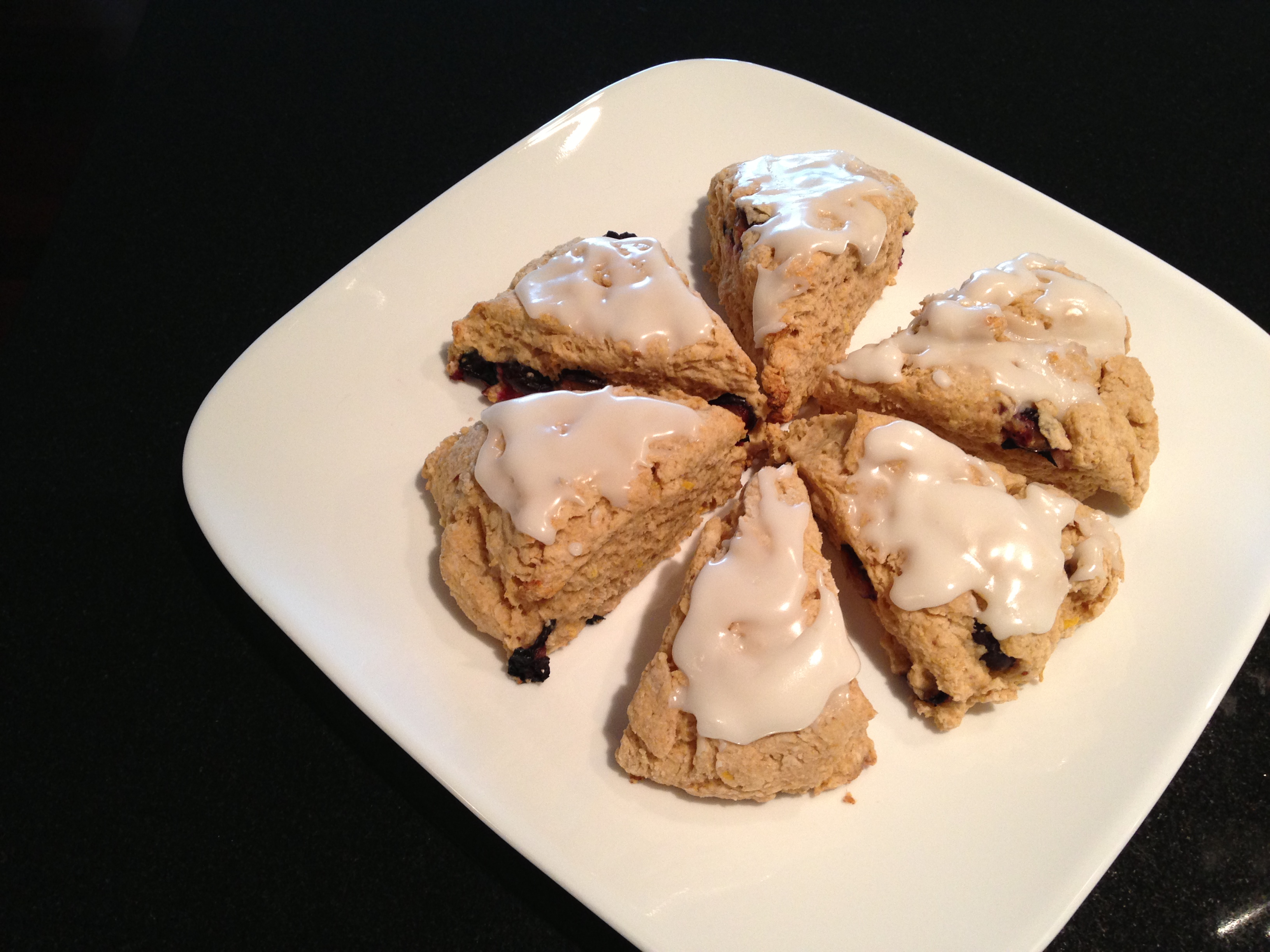 Sift together flour, baking powder, sugar, and salt in large bowl. With two knives or a pastry blender, cut margarine into the flour mixture. It should look like a coarse meal. Stir in the lemon zest and make a well in the mixture. Pour in the soy milk and mix just until it starts to form dough. This is a very sensitive dough and being mindful of not stirring too much is a good thing. Gently stir in the blueberries and begin to gently kneed with hands. Again, very little. Just enough to make a slightly sticky dough. If too thin, add more flour. If too thick, add more soy milk. Move dough to parchment paper and gently form into a cylinder, about an inch tall. Cut into eight wedges and place on an ungreased baking sheet. Bake until light brown, about 12-15 minutes. Cool on wire rack for at least 10 minutes before adding icing.