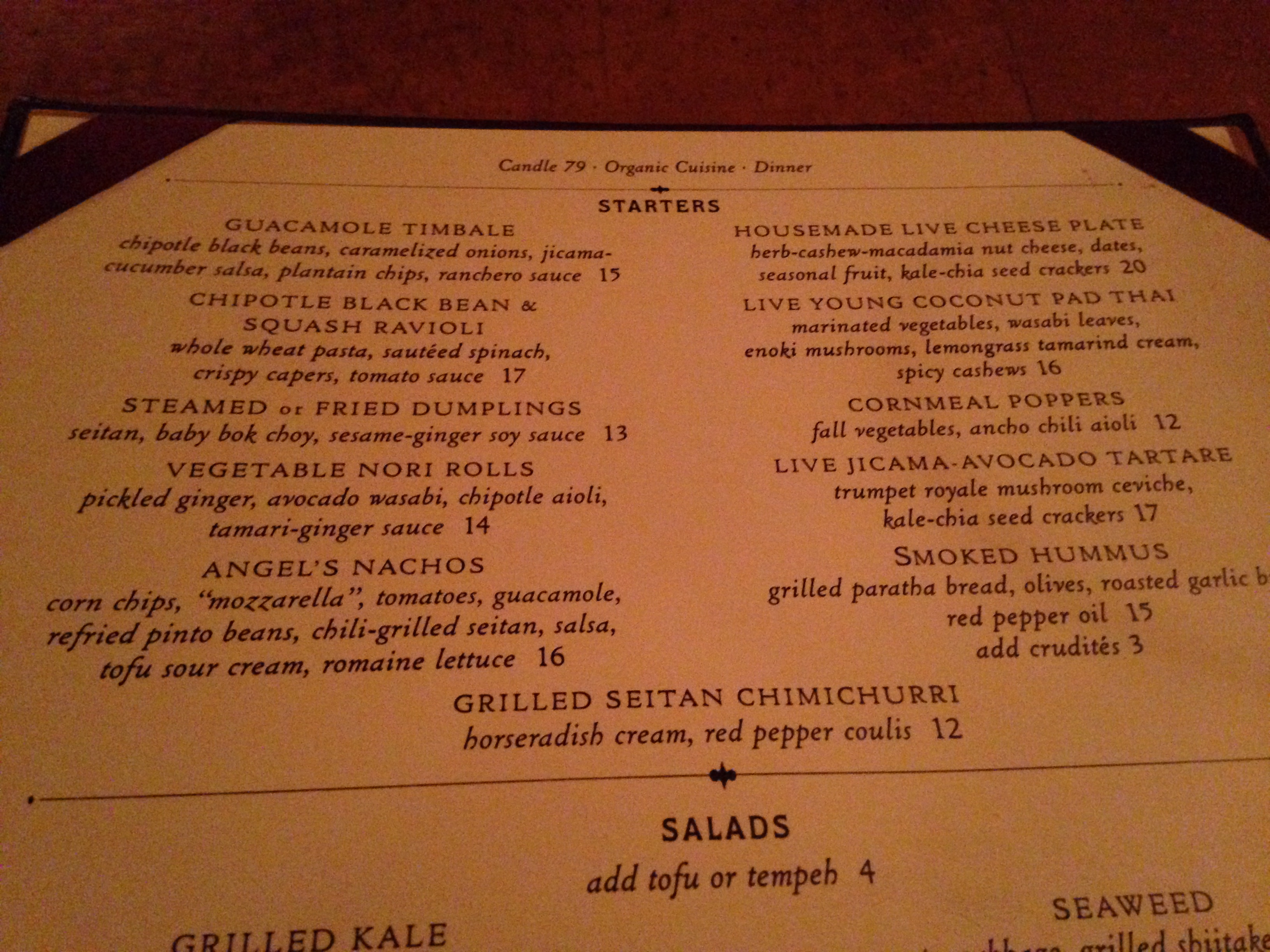 The trip to NYC was for me birthday. So fun. On my actual birthday, I got to have dinner at Candle 79. I had read about this restaurant for years and longed to try it, but had not had the opportunity until now. Oh, it was delicious.