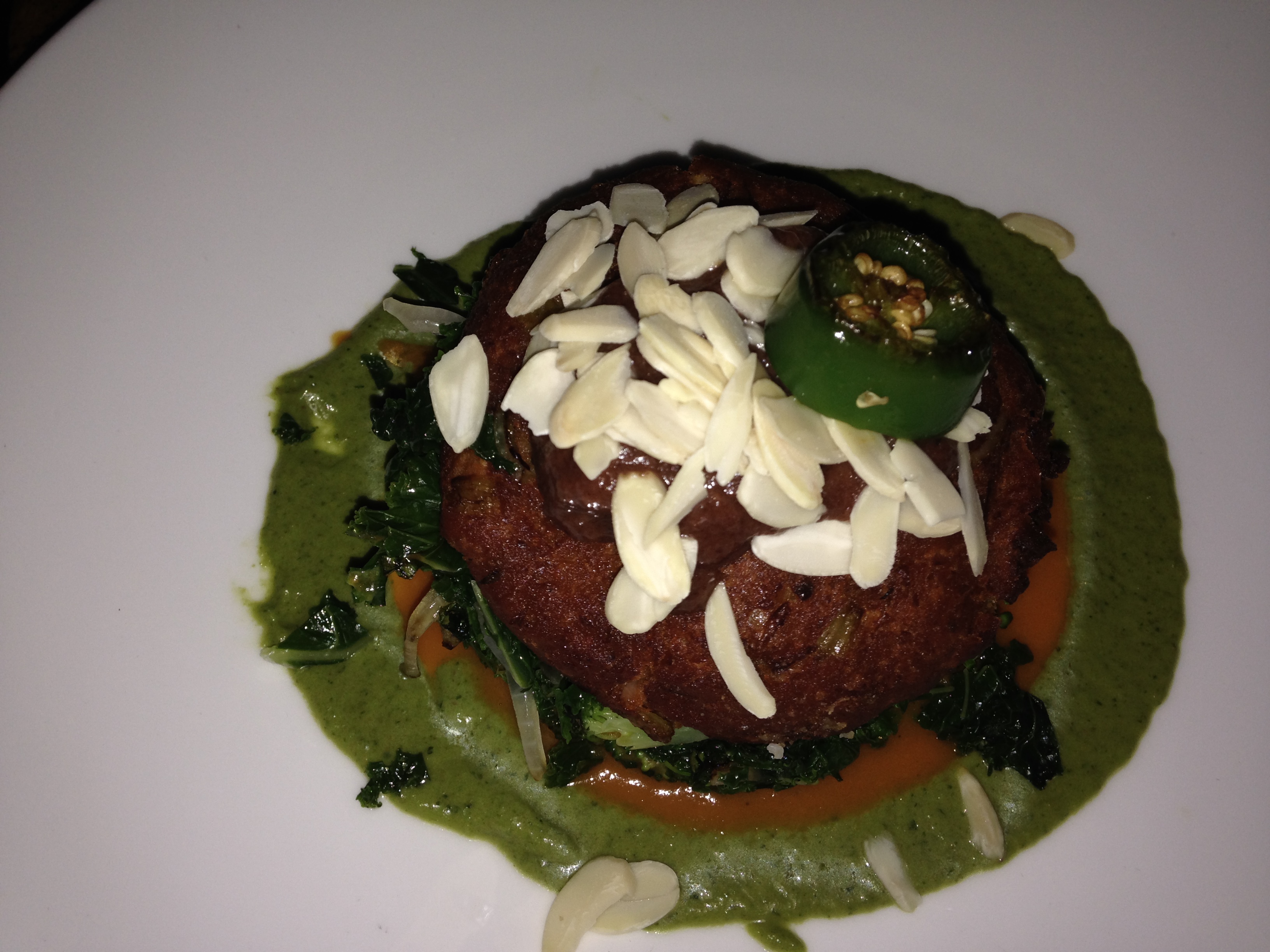 For my entrée, I was thrilled by a wild mushroom-squash risotto and hubby selected the Moroccan spiced chickpea cake. Both were wonderful, but beware the jalapeño on top of the chickpea cake. It is super spicy!