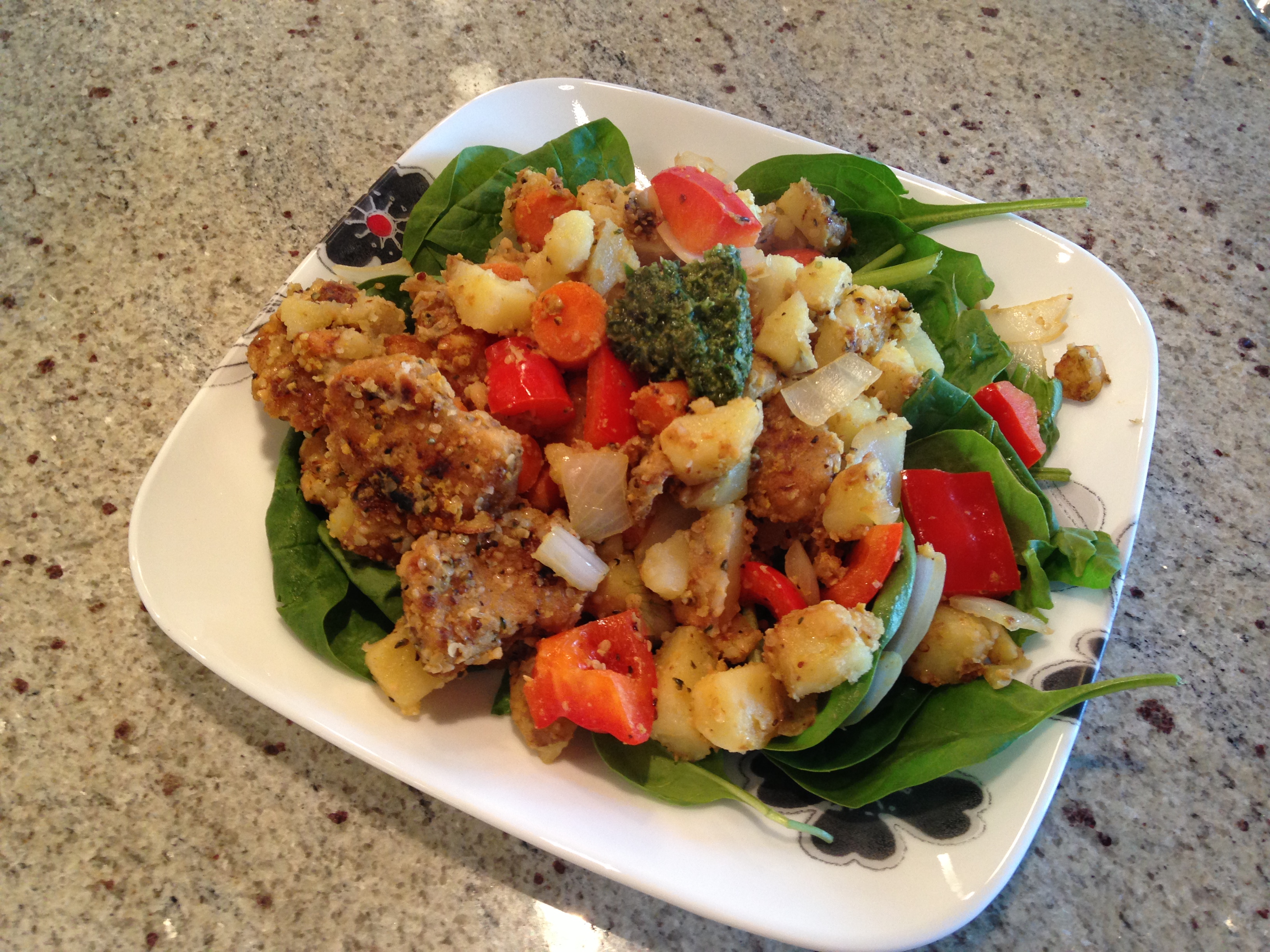 Saute onion, garlic, potatoes, and carrots in avocado oil until cooked, about 15 minutes. Add the red bell pepper about half way into the other vegetables being fully cooked. Prepare the non-chicken according to the directions on the package and add to pan. Add sesame seeds and salt and pepper to taste. Serve hot over a bed of baby spinach with a dollop of pesto on top. Yummers!