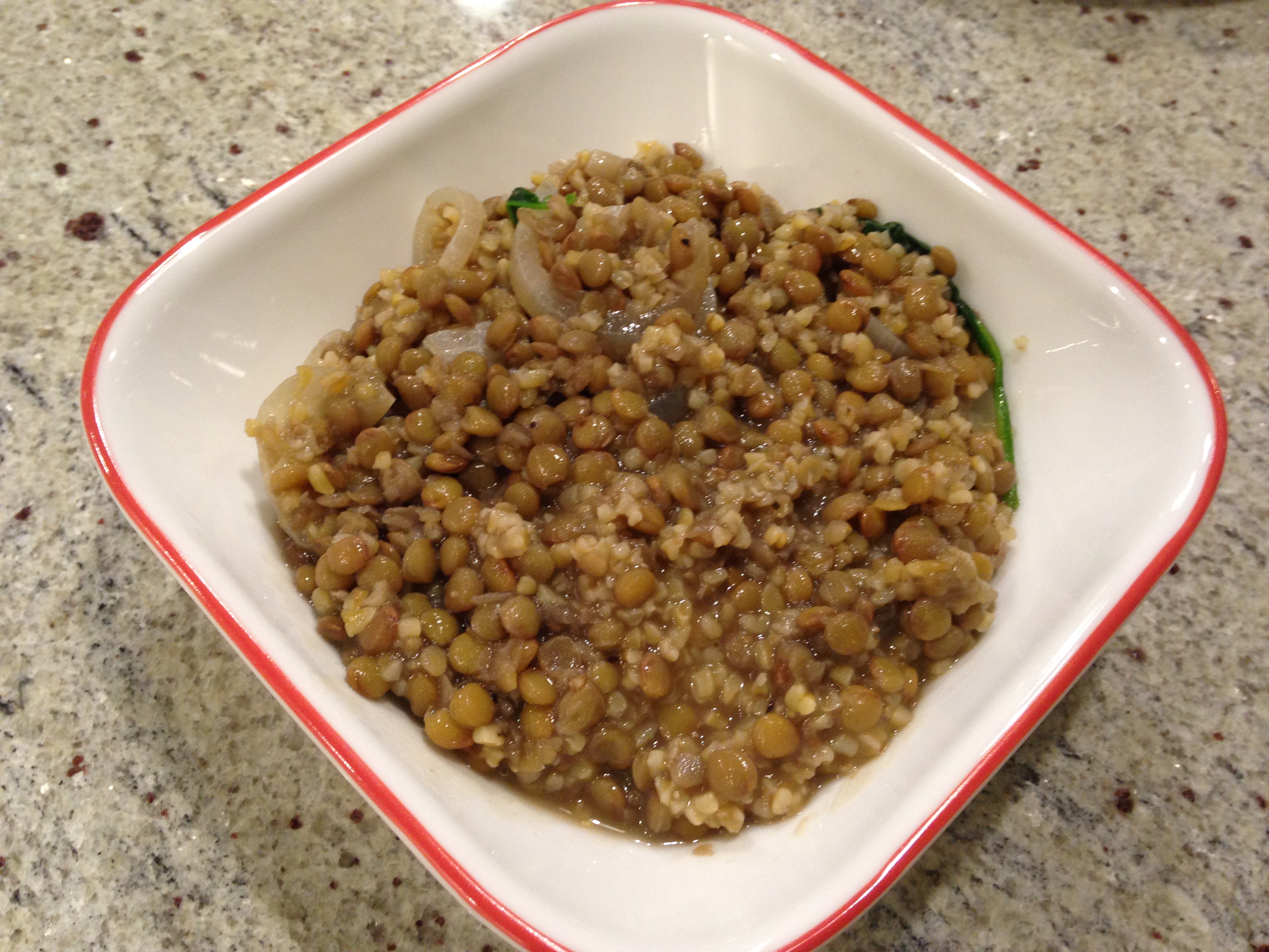 Bring water and lentils to boil in medium pot. Turn heat down to simmer, cover, and cook about 20 minutes, stirring every so often. Add bulgur, salt, and pepper and continue to cook, with occasional stir, until lentils are soft, about 15 minutes. Water can be added if needed. Remove pot from heat and, if using spinach, add spinach to wilt in the pot. Sauté the onion and other greens, if using, with avocado oil in a separate pan and then add to the stew. Stir everything and serve hot. For an extra kick, squeeze a little lemon juice on top. Yummers!