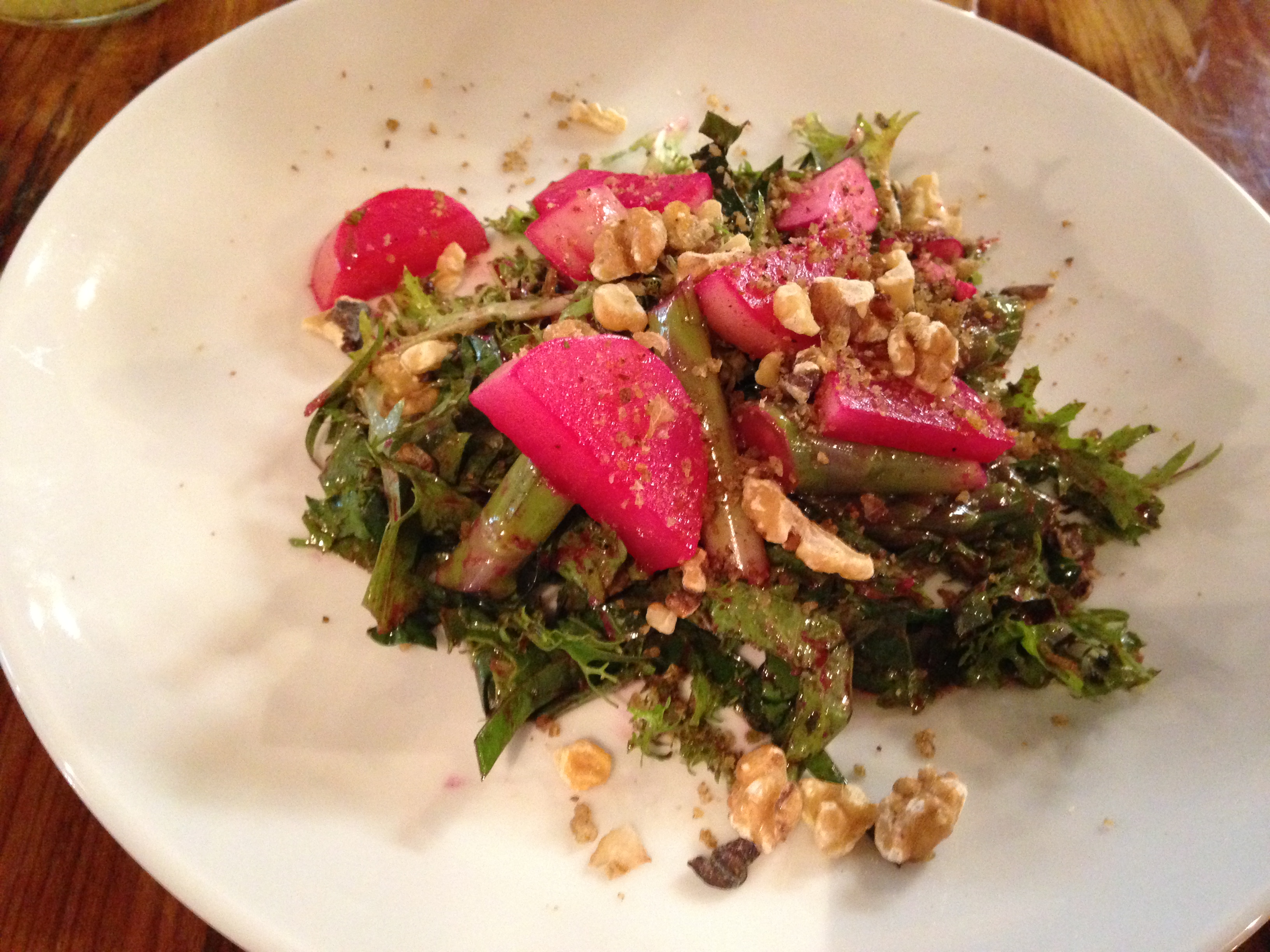 Next came a wonderful salad of hearty greens, pickled beets, and walnuts. I scarfed it down.
