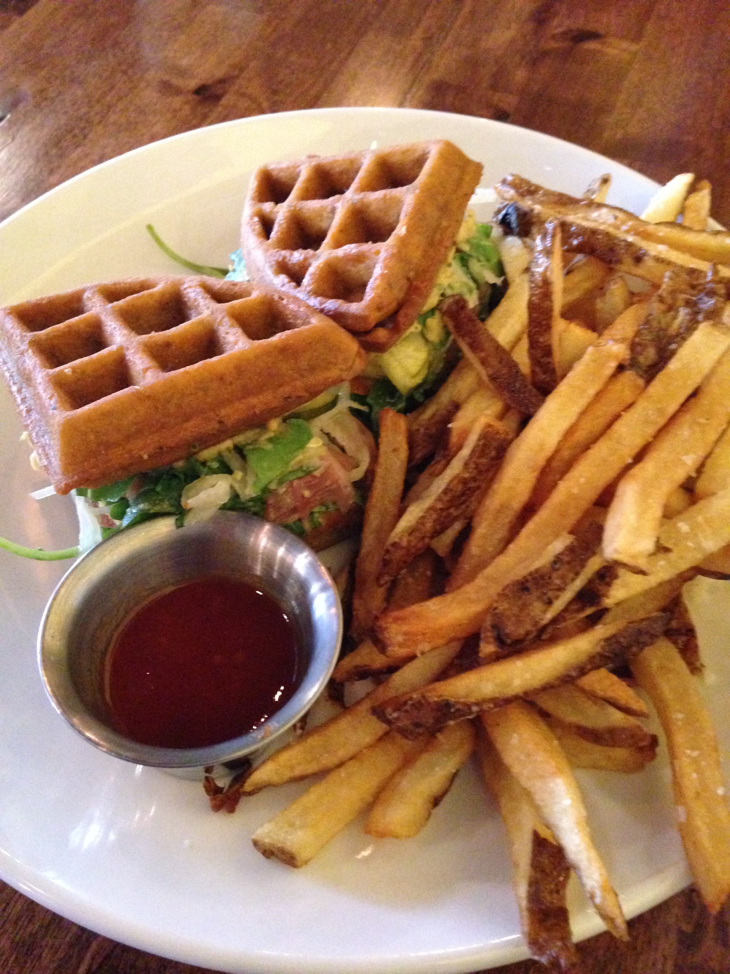 If in Omaha, this sandwich is absolutely worth eating. The Farnam House Brewing Company recently opened and this Falafel Waffle is gluten-free and can be ordered vegan. It’s delicious. The falafel has yummy salad greens and hummus inside. Yummers!