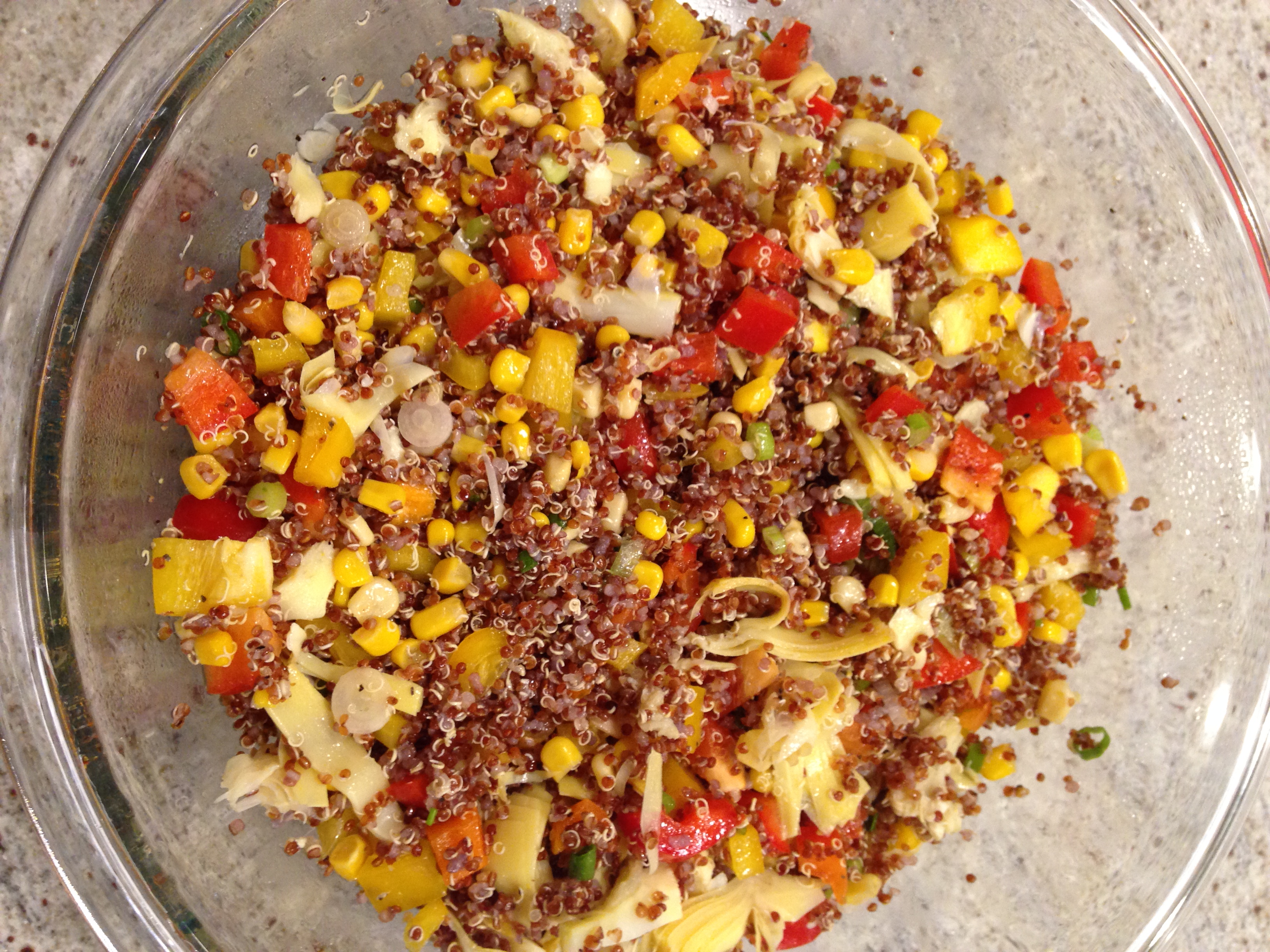 An upcoming potluck after work required me to think ahead on what to take that would be easy to make and transport. Looking around my pantry and fridge, I came up with a cold quinoa salad that was a big hit. What you will need: