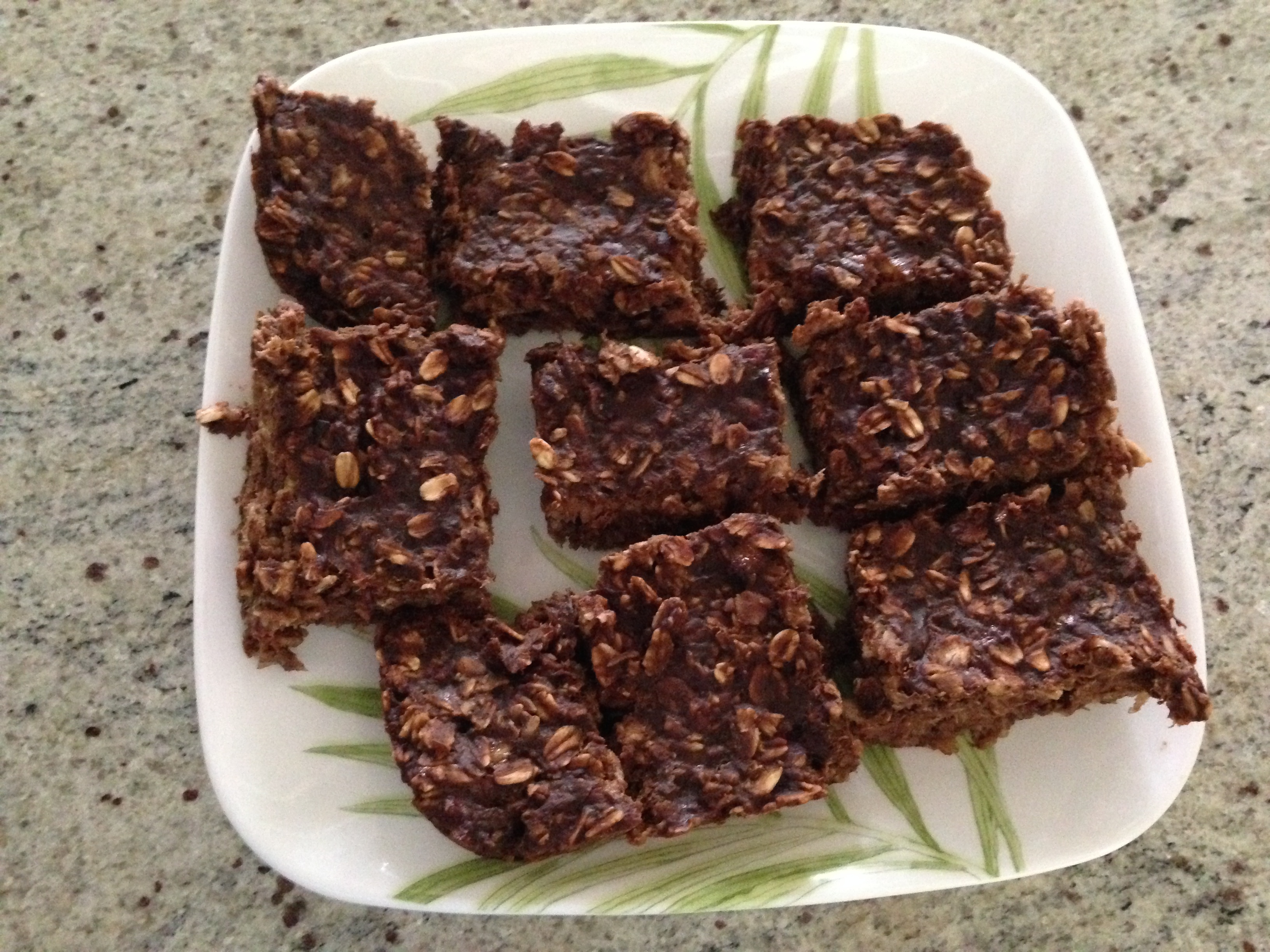 Preheat oven to 350. Mix everything together and place in a small glass baking dish. A square one or smaller rectangle will work well. Back for 20 minutes. Let cool and cut into desired sizes. Store in fridge for up to three days or freeze. Yummers