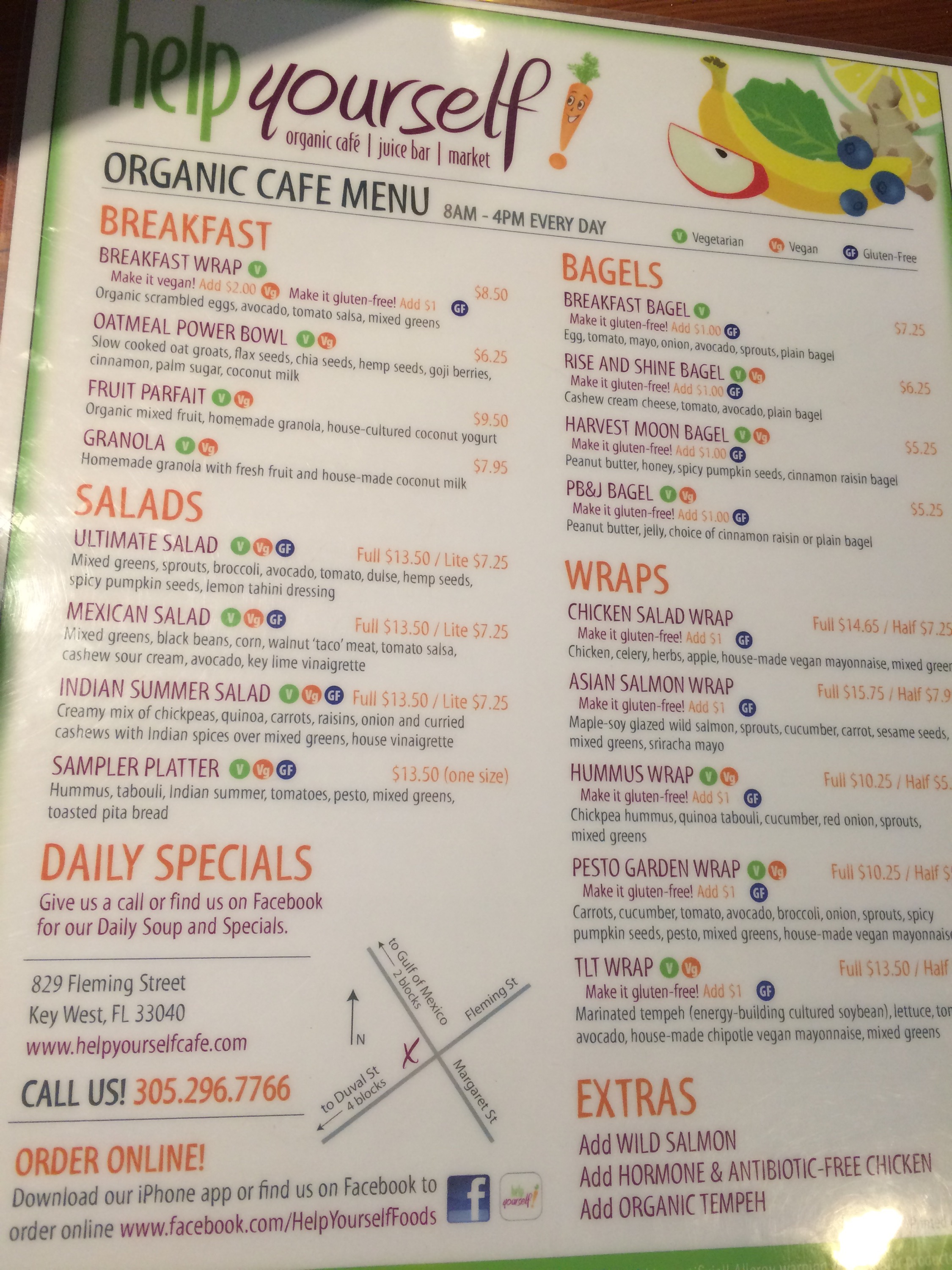 Walking around Key West today, we of course got hungry. My phone could not get a reliable signal to explore Happy Cow, but hubby could use Google Maps on his phone. A quick search of vegetarian quickly identified this adorable small grocery and lunch counter with lots of clearly noted vegan options on the menu.
