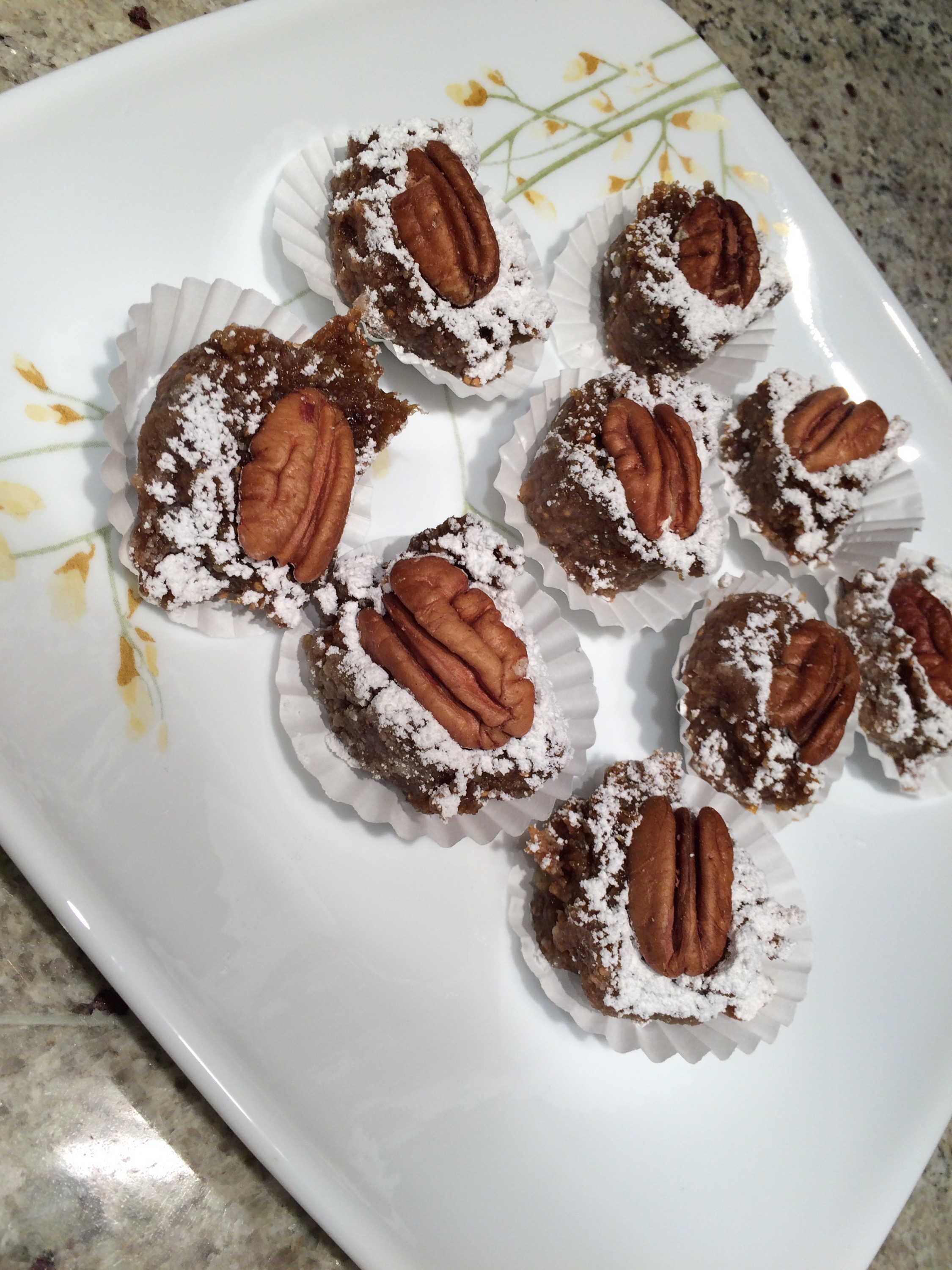 Place the figs, dates, and walnuts in a food processor and process until it stops. Add the orange zest, orange juice, and lemon juice. Process again until well mixed and firm-ish. Powder a piece of parchment paper with powdered sugar and move the mixture to the paper. Roll into a long roll, about 15 inches long. To roll properly, it will be covered in sugar. Cut into 1/2 inch circles. Or ovals. Most of mine cut into ovals. Place oval side up on a clean piece of parchment. Once all cut, powder the tops with more powdered sugar to make look pretty and top each piece with a pecan half. Let sit for at least three hours. This lets them set. Now can move to a plate to serve or place in the fridge for later. Yummers!