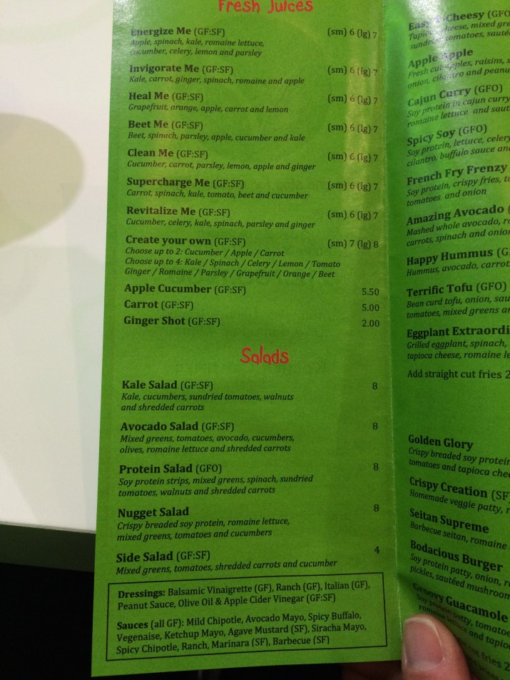 I ordered the Groovy Guacamole Burger with Avocado Mayo and Emergize Me fresh juice. Both made after I ordered. I also ordered a piece of peanut butter bomb cake, but got the pumpkin. Be prepared to not get exactly what you ordered.