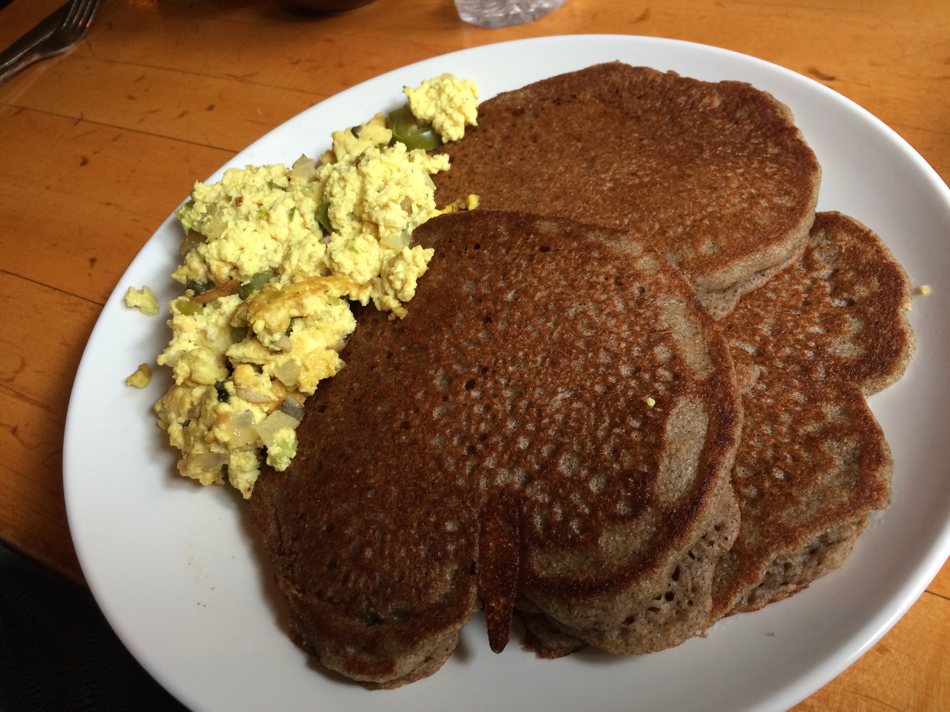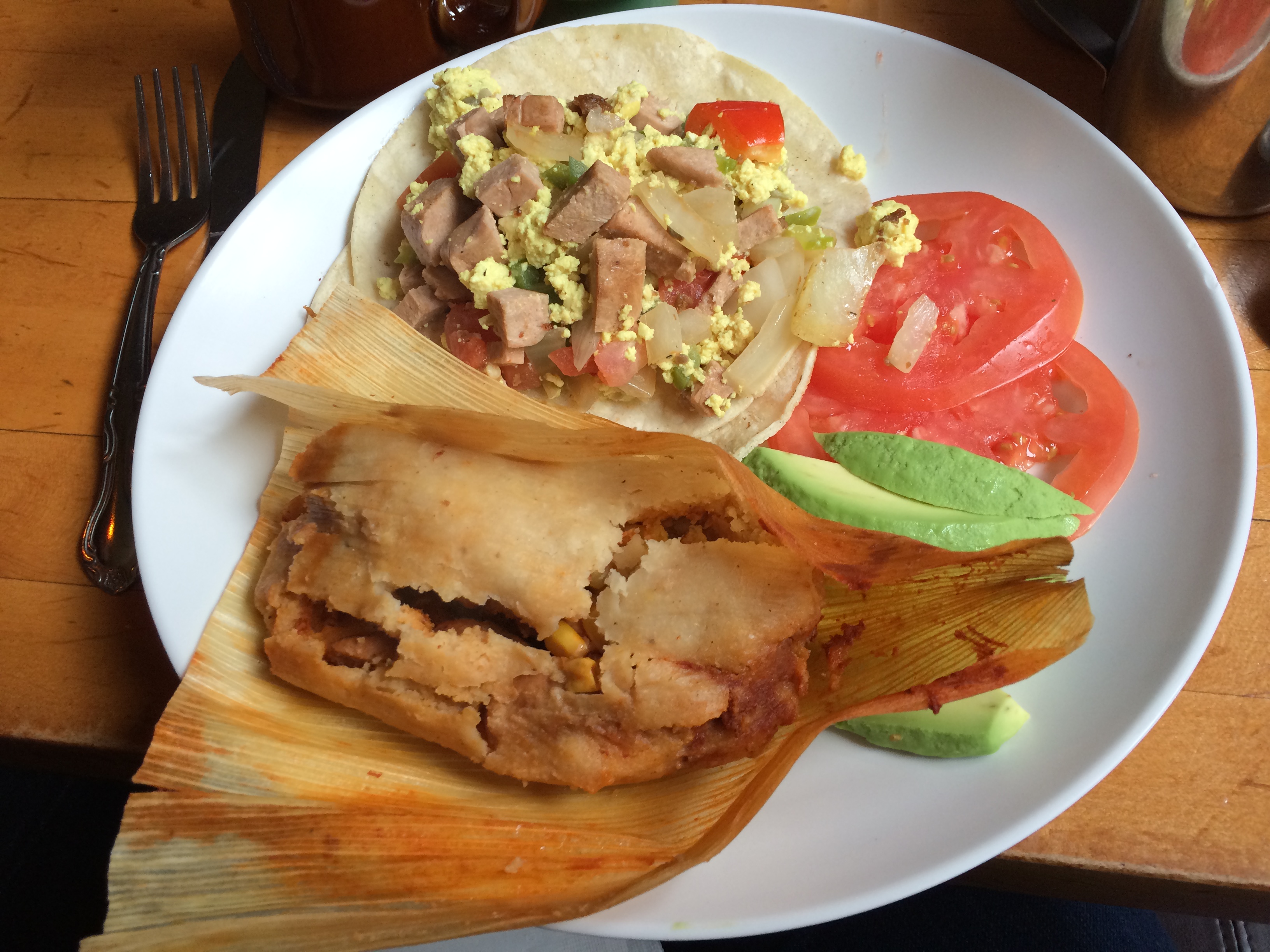 The pancakes had a nice flavor, but were a bit dry. The tofu scramble was also dry. I felt like they would have benefited from a sauce of some sort. My tamale had a good flavor.