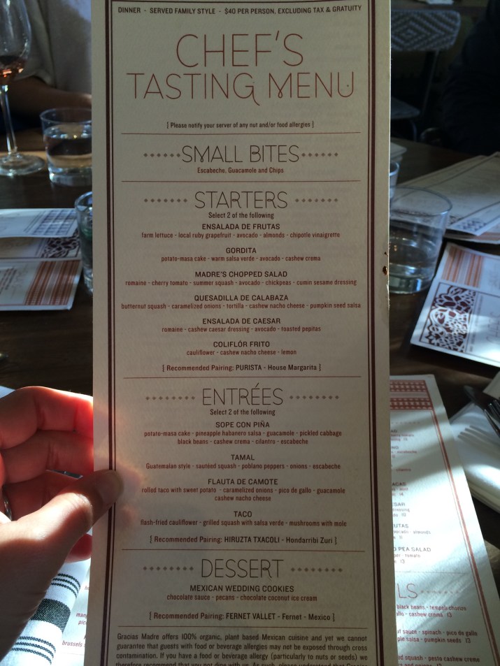I don’t even know how to share the wonderfulness that is Gracias Madre. It’s a Mexican restaurant owned by the same people that started and own Cafe Gratitude. Their garden fuels much of the offerings and the food is exquisite. We ordered menu tastings and got more food than we should have eaten. But we couldn’t help ourselves.