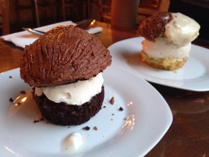 Oh so yummy. A spot on “soul food” meal. Somehow we had room to try dessert. It was worth every bite. I picked an extreme chocolate cupcake to be turned into a cupcake sandwich with vanilla ice cream. Hubby did the same with a black and white cupcake. Hubby also ordered a strawberry smoothie made with ice cream.