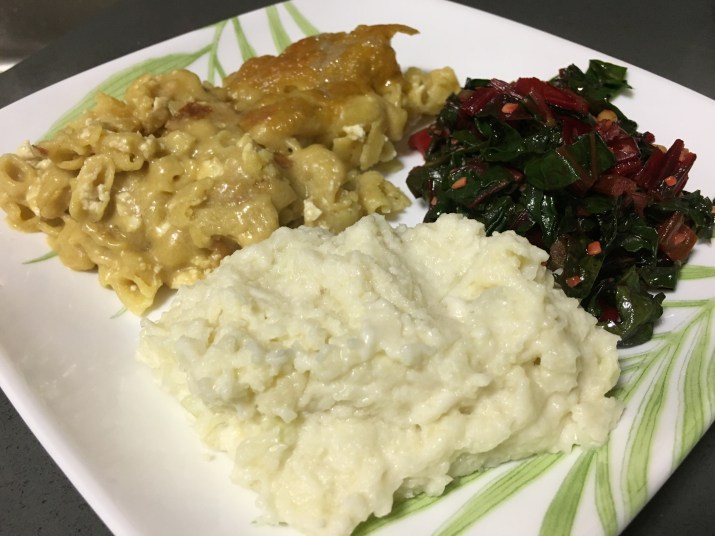 Mmm… Looking for an alternative to mashed potatoes? This is an easy and tasty one. This cauliflower mash was a perfect compliment to macaroni and cheese and avocado oil sautéed red chard with garlic and pine nuts. What you will need: