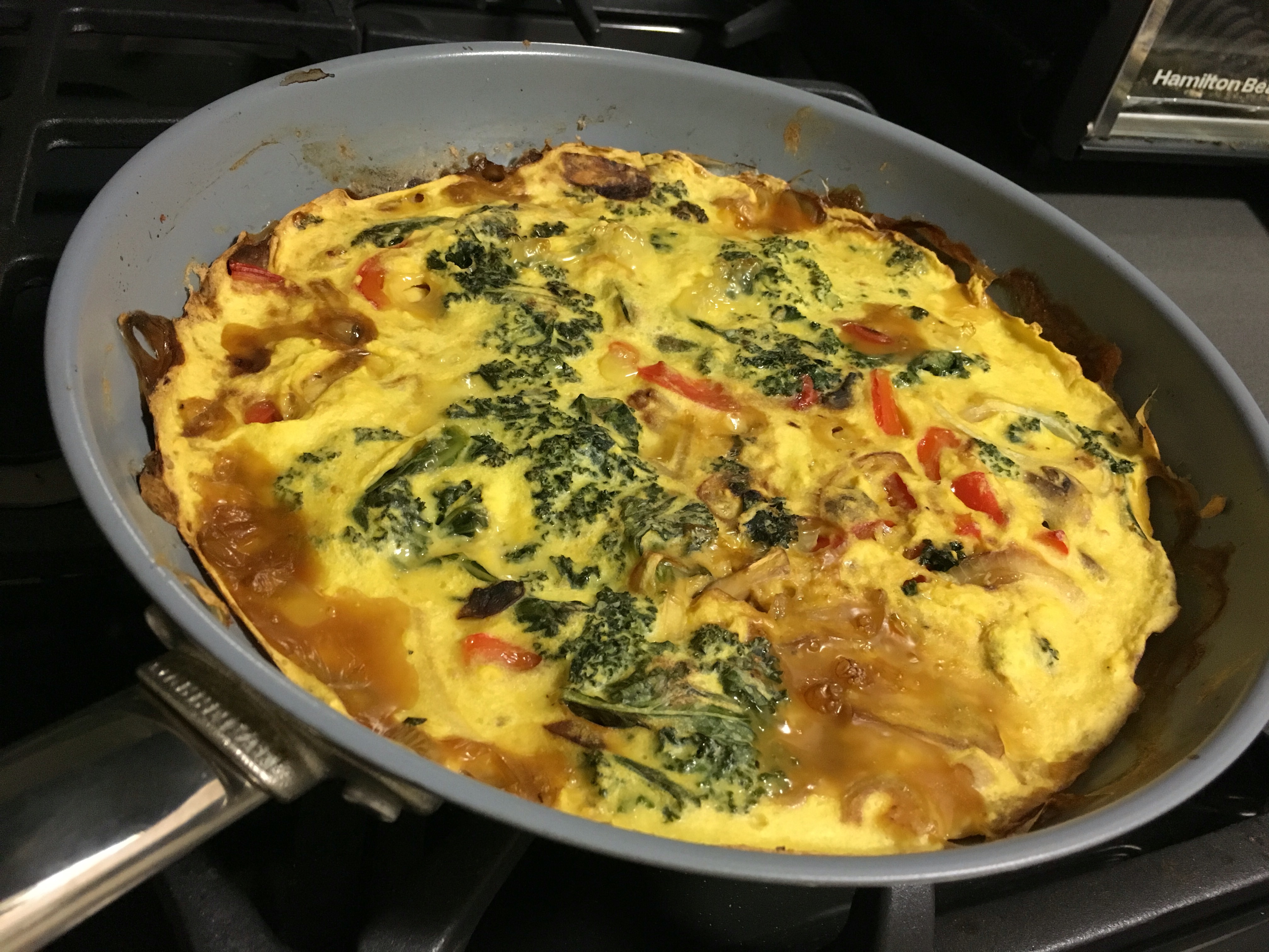 Woo hoo! Finally found the VeganEgg at a local grocery. Now what? It has been almost two decades since I cooked with eggs. Also, I have read reviews that this product will mimic the texture of eggs, but not the full flavor. Okay. So make something with egg that has its own personality. Frittata!
