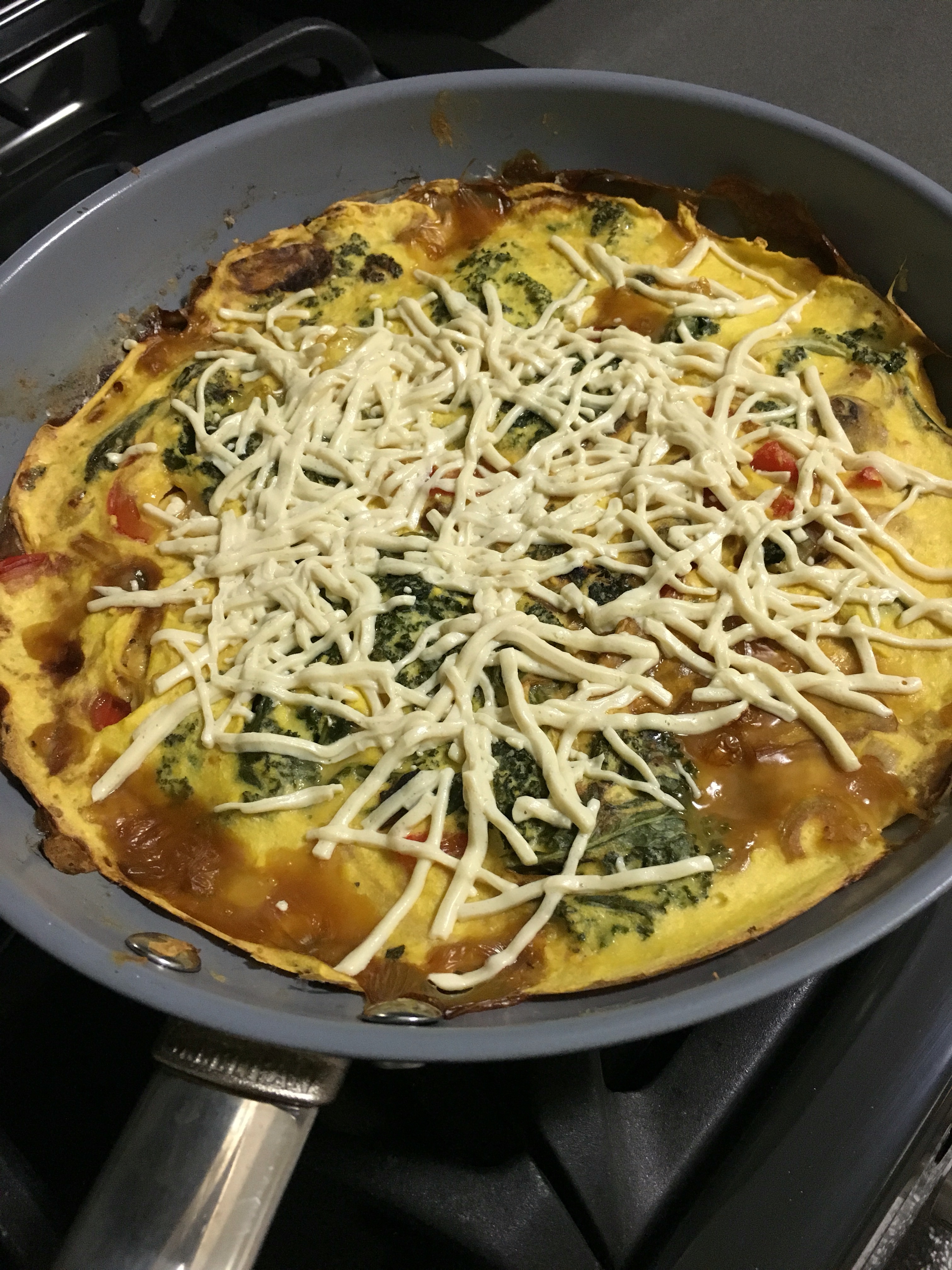 Preheat oven to 450. Sauté at medium all but the VeganEgg until soft. Add VeganEgg and stir together. Make everything flat and raise burner heat to medium high. Let cook until the sides are pulling away from the pan. Move pan to oven and cook until top is browning.