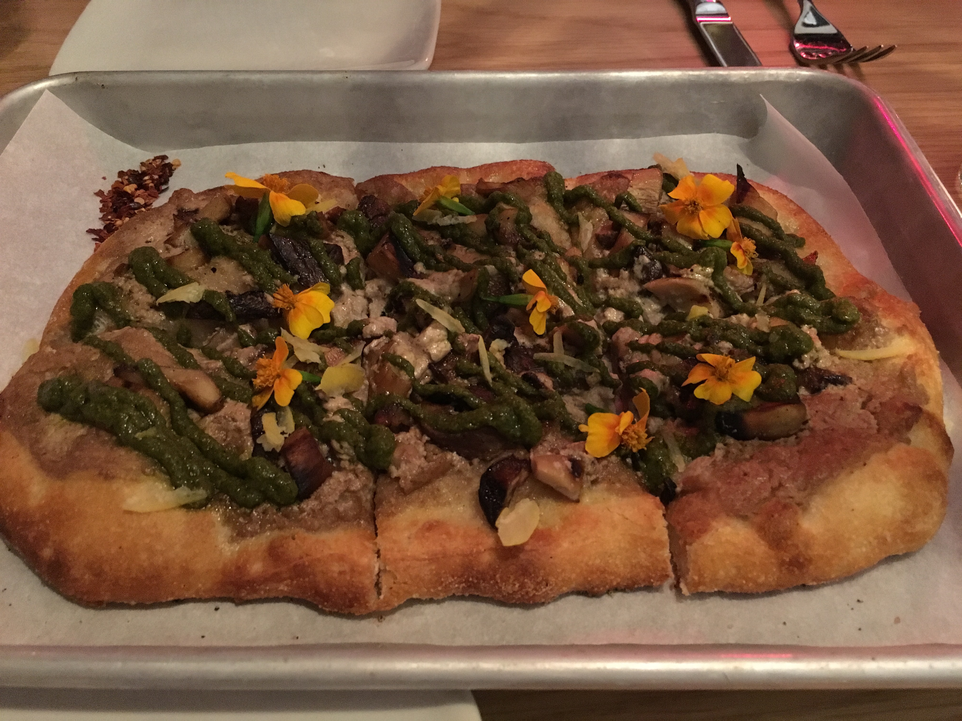 The entire space is communal high-top wood tables. The walls are lined with vegan wines that lead eyes to an open kitchen. And the waitstaff is very kind, bonus! I couldn’t ask for a better pizza night.