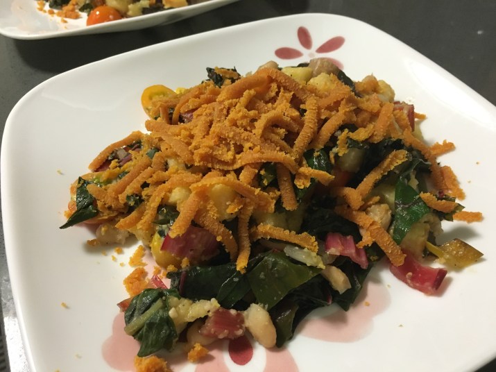 One bunch of rainbow chard, cleaned and chopped into ribbons