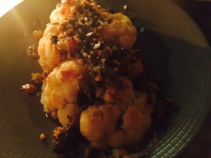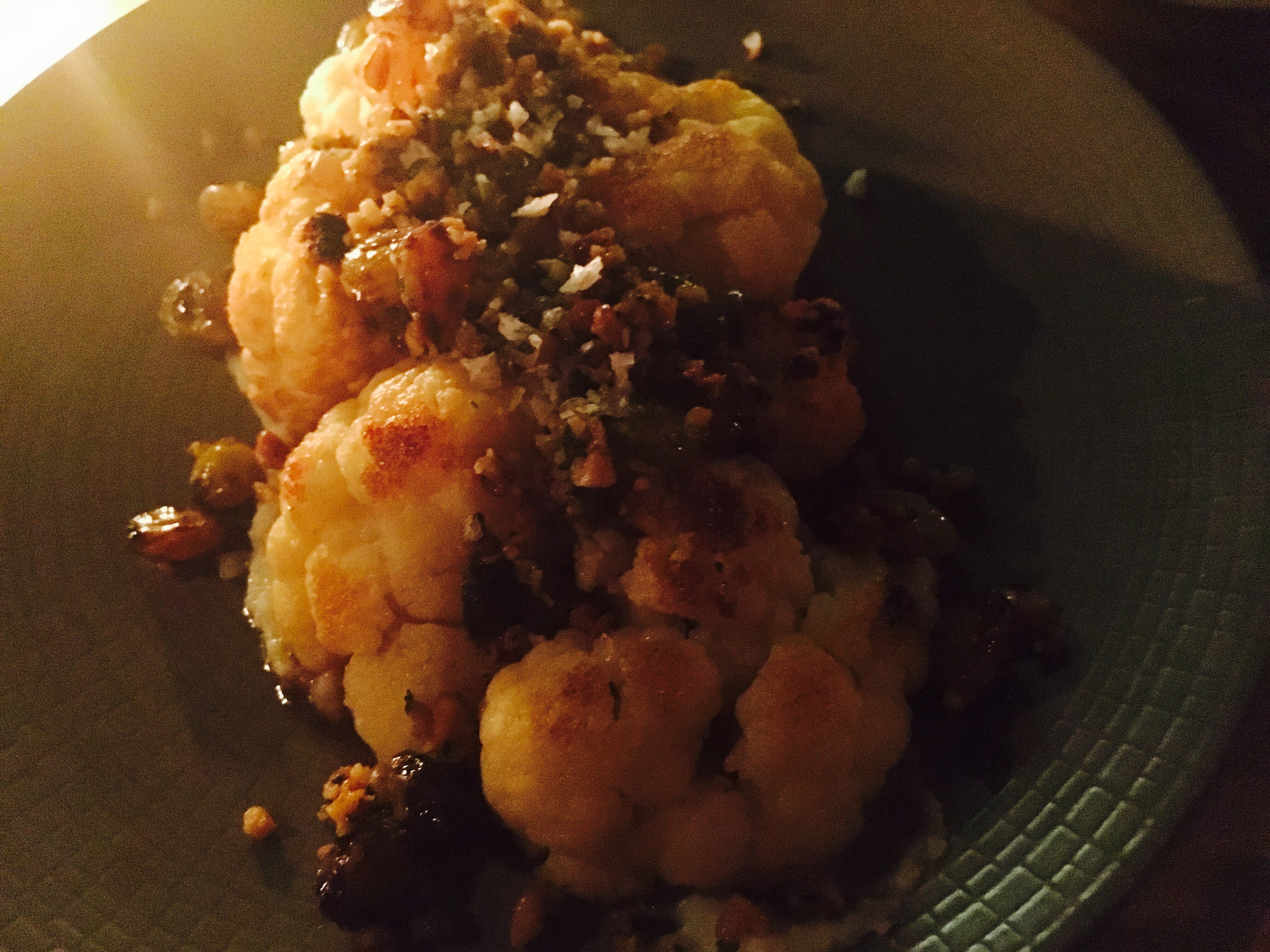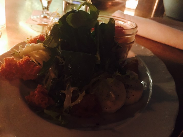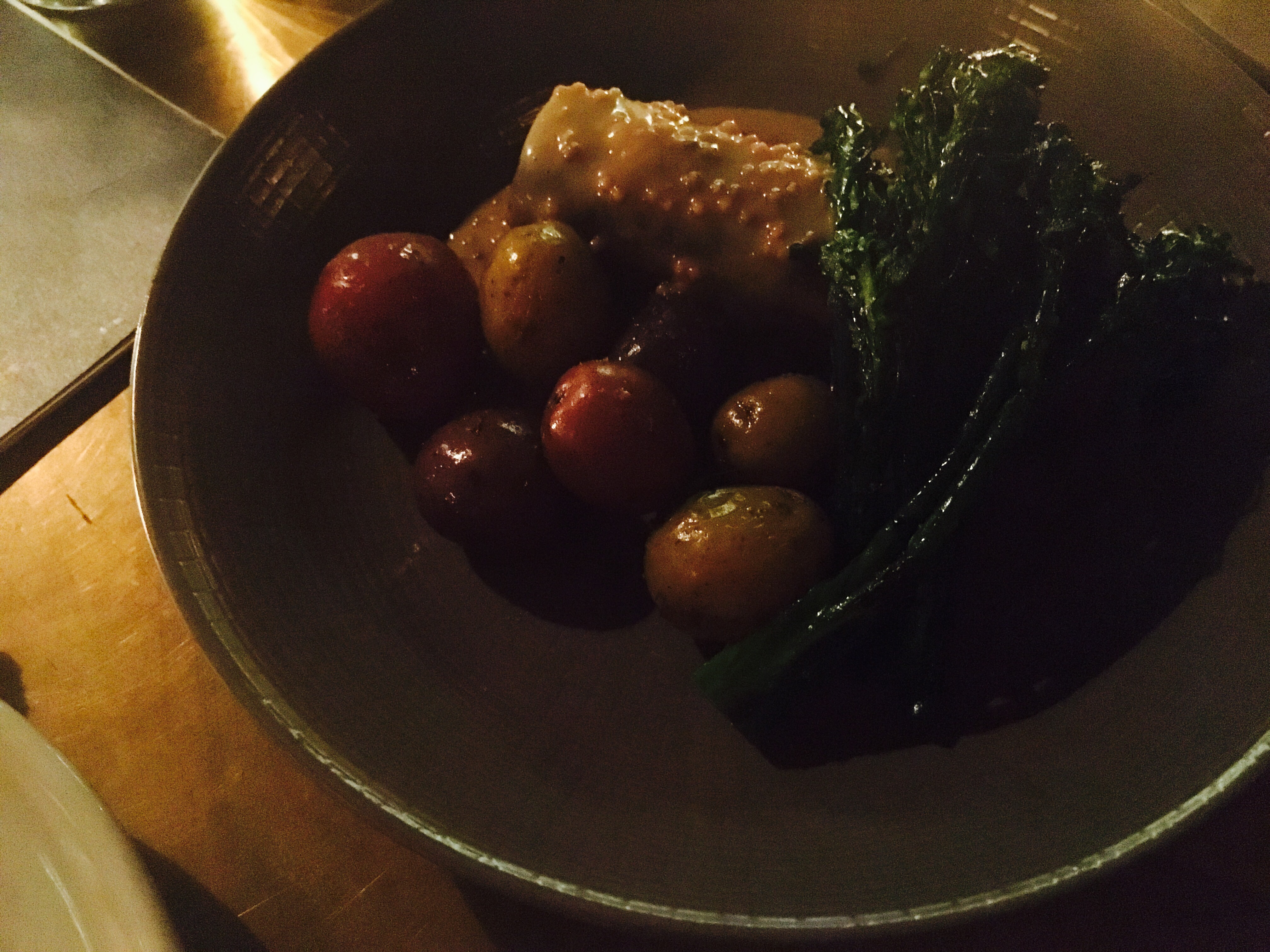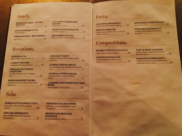 We sat at the bar and decided to try four plates. Smoked Cauliflower, Heirloom Beet Salad, Carrot Mousse, and Tofu & Bean Sausage. Each dish was wonderful in a special way. The flavors are so well developed and not at all overwhelming. Yummers! The atmosphere is also very enjoyable with a dark speak-easy meets farm-to-table feel.