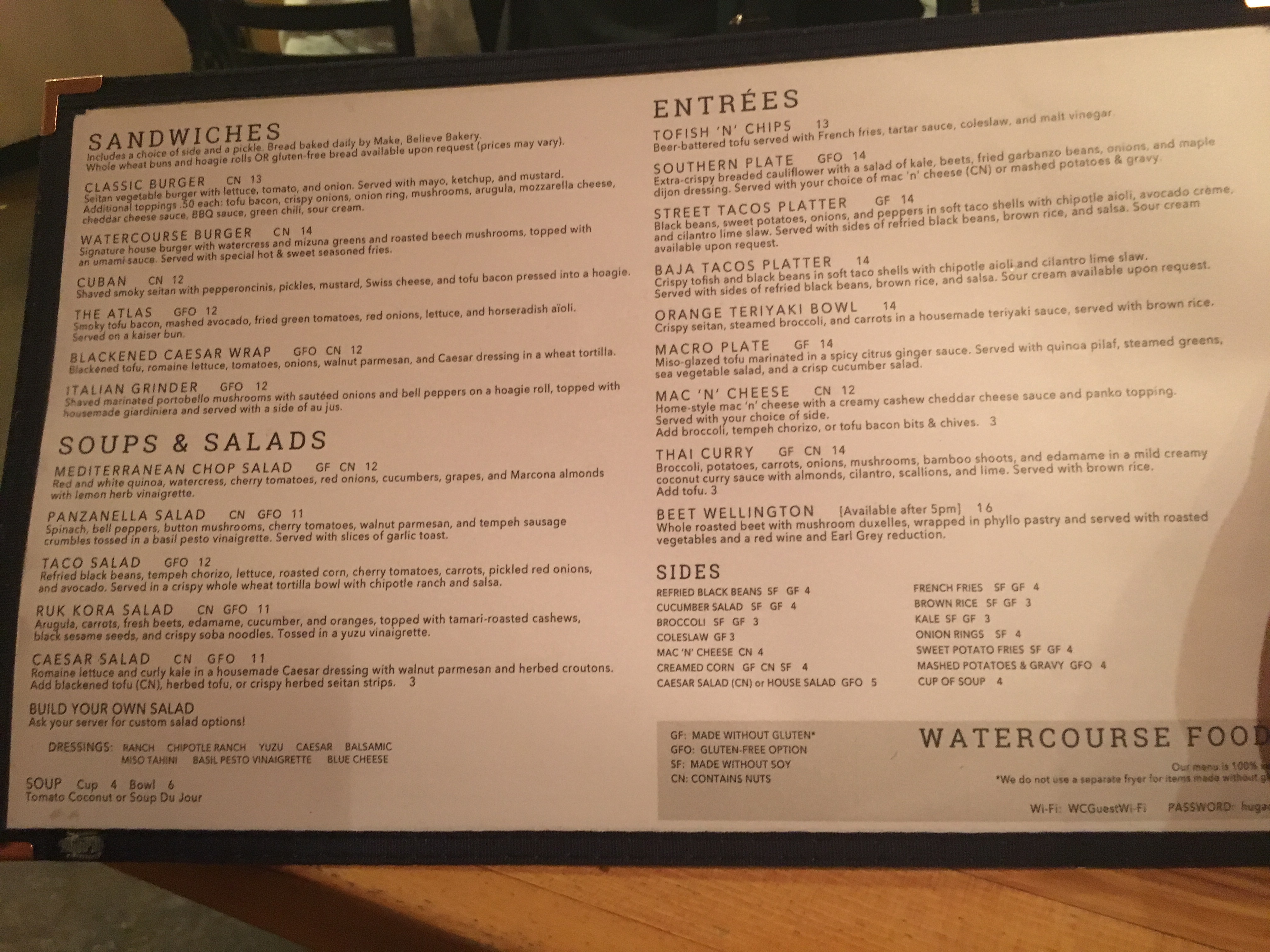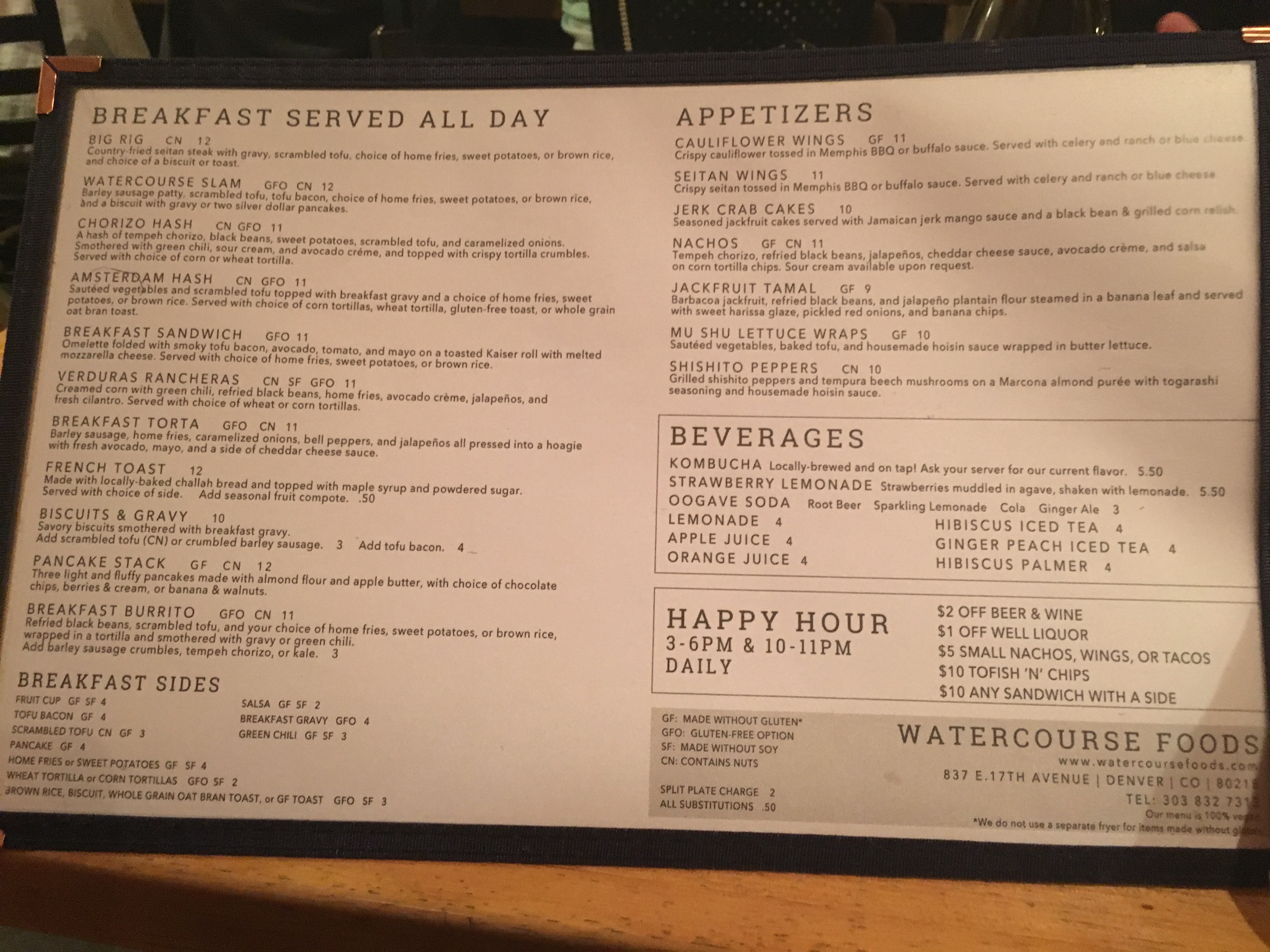 I ended up at Watercourse Foods in Denver, Colorado by accident. I had originally landed at a place a vegetarian friend recommended, but there was a 45 minute wait. Yikes. So I got on my trusted Happy Cow app, found Watercourse Foods, called to find out their only 15 minute wait and headed over.