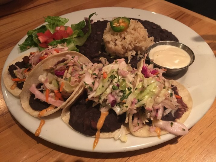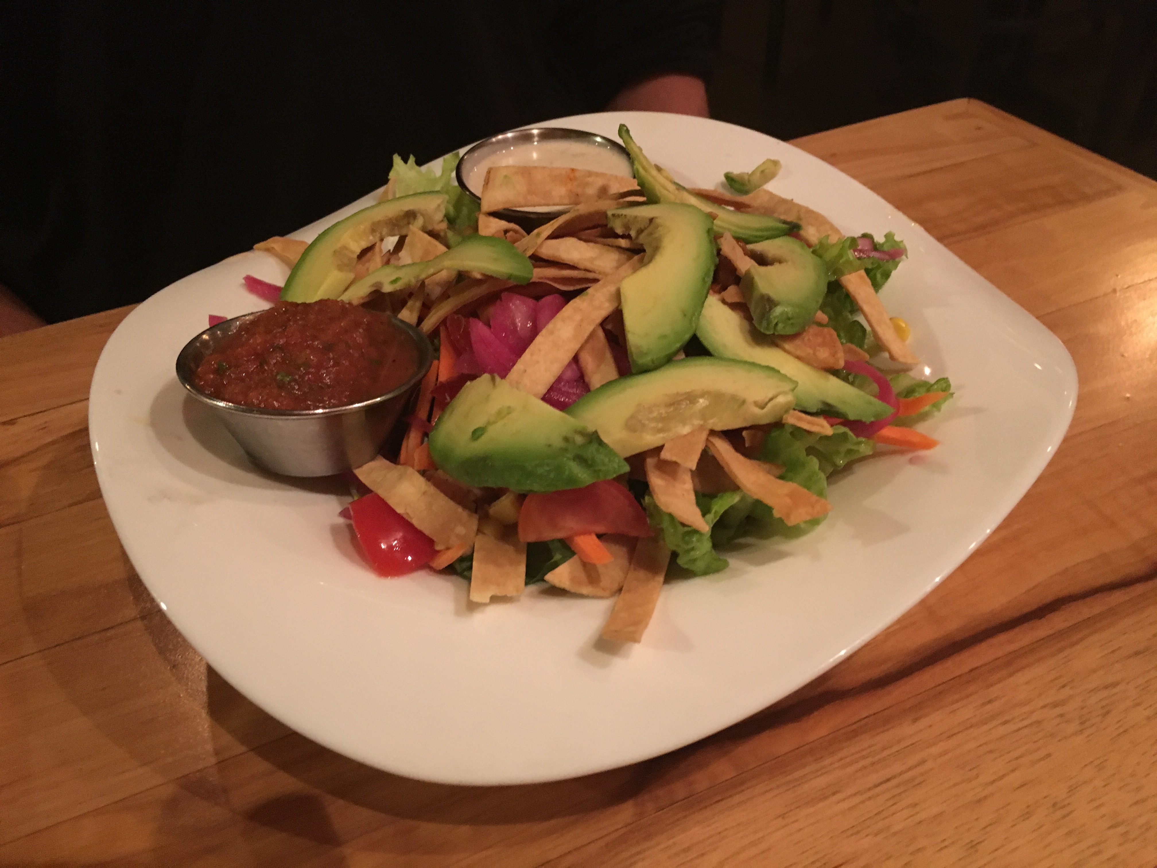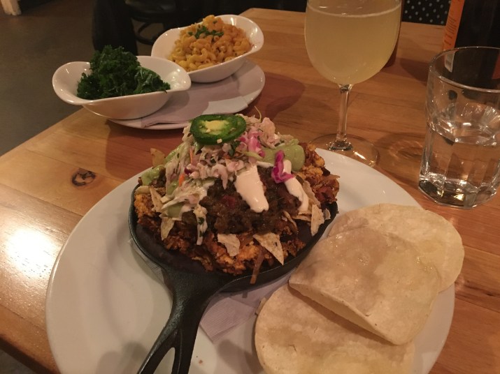 The hash was too spicy for me. Right? How is this possible? Not sure, but I did love the green chile. The kale was garlicky and delicious. The Mac N Cheese was not as creamy as hoped, but tasty nonetheless. My dinner buddies got a taco salad and “fish” tacos. Both also yummy.