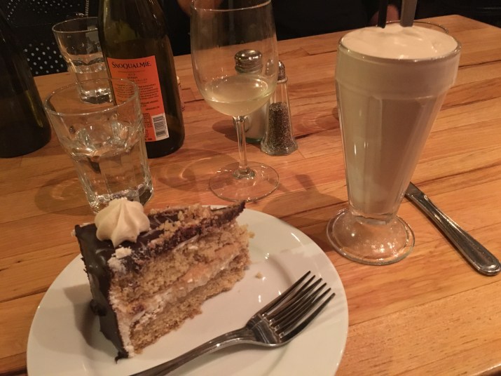Although we couldn’t finish what we ordered, we got a couple desserts to try. The special was a Boston Cream Cake – ordered! And we got a peanut butter chocolate shake. Mmm…