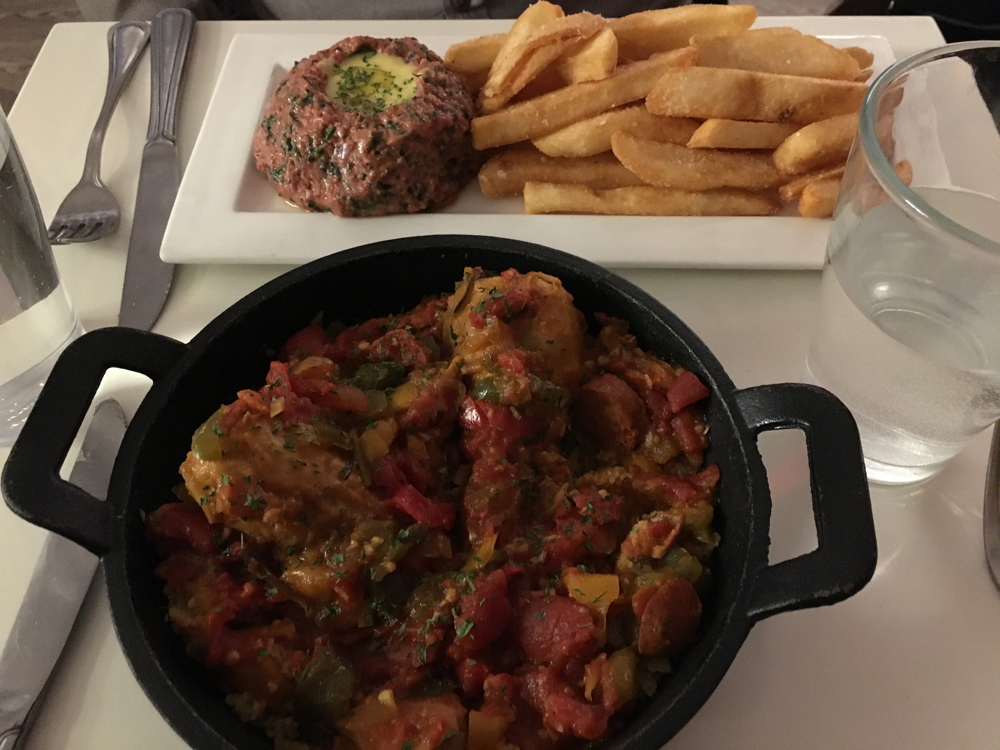 I’m always hesitant with faux meat options as I don’t normally enjoy them much. But it’s faux meat or ratatouille here. I ordered the Poulet Basquaise and hubby got the Steak tartare vegetable accompagne de frites maison.