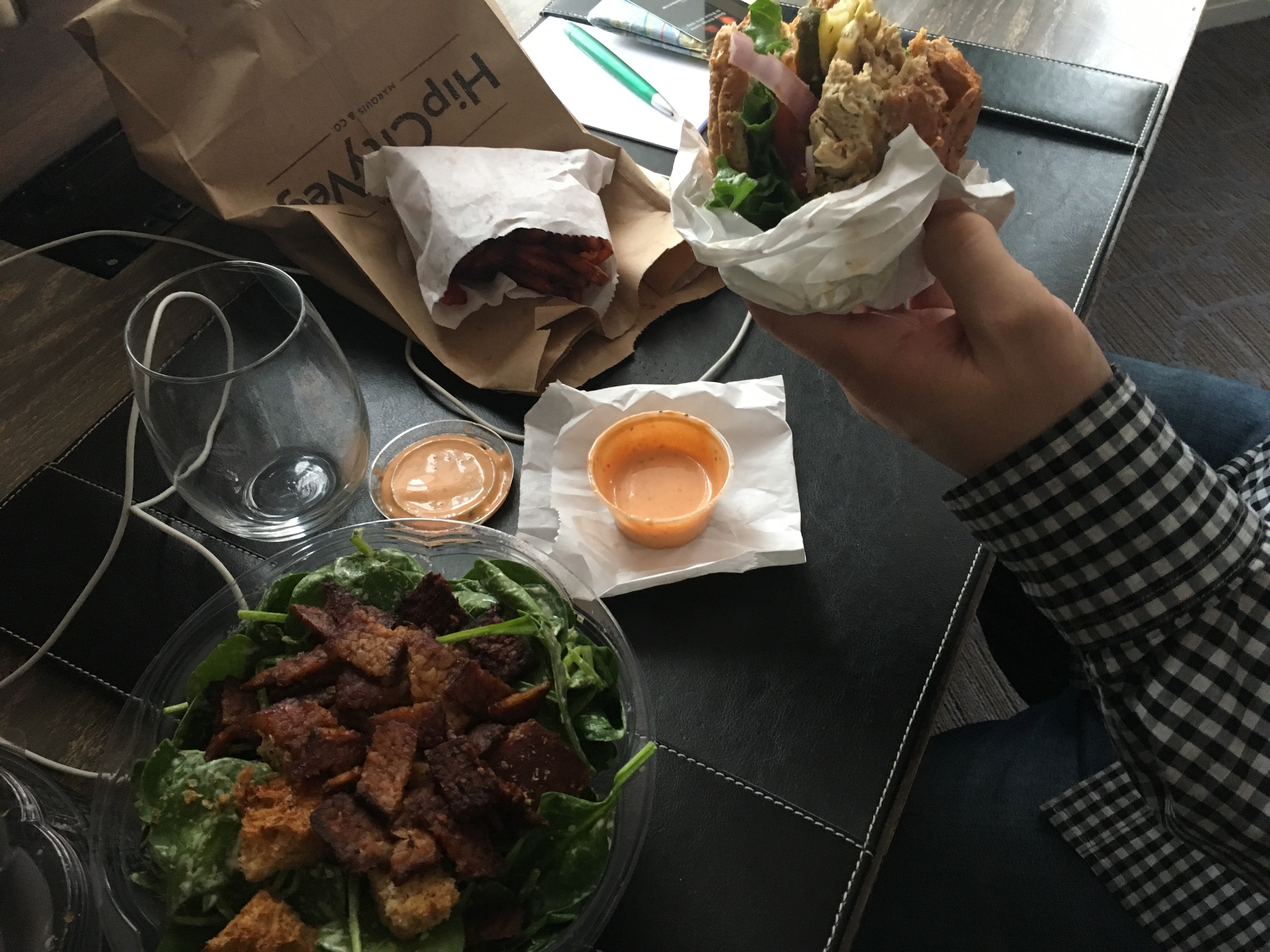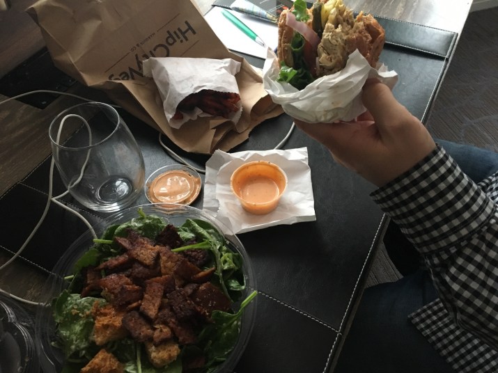 Holy yummers, vegans! I got a Spinach BLT Salad and hubby picked out the Crispy HipCity Ranch sandwich. I also got us a side of sweet potato fries.