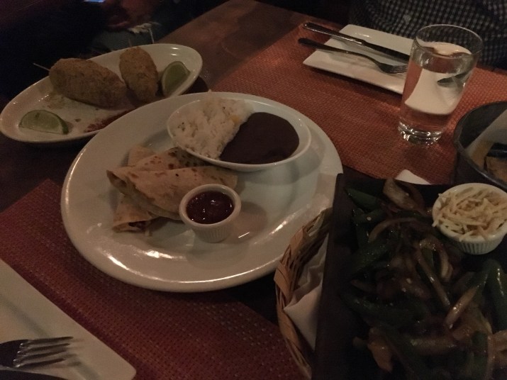 We started with excellent guacamole. Some of the best guacamole since moving to NYC. But the chips are super salty. Then we enjoyed some elote, which is corn on the cob covered in yummies, and soy chorizo quesadillas.