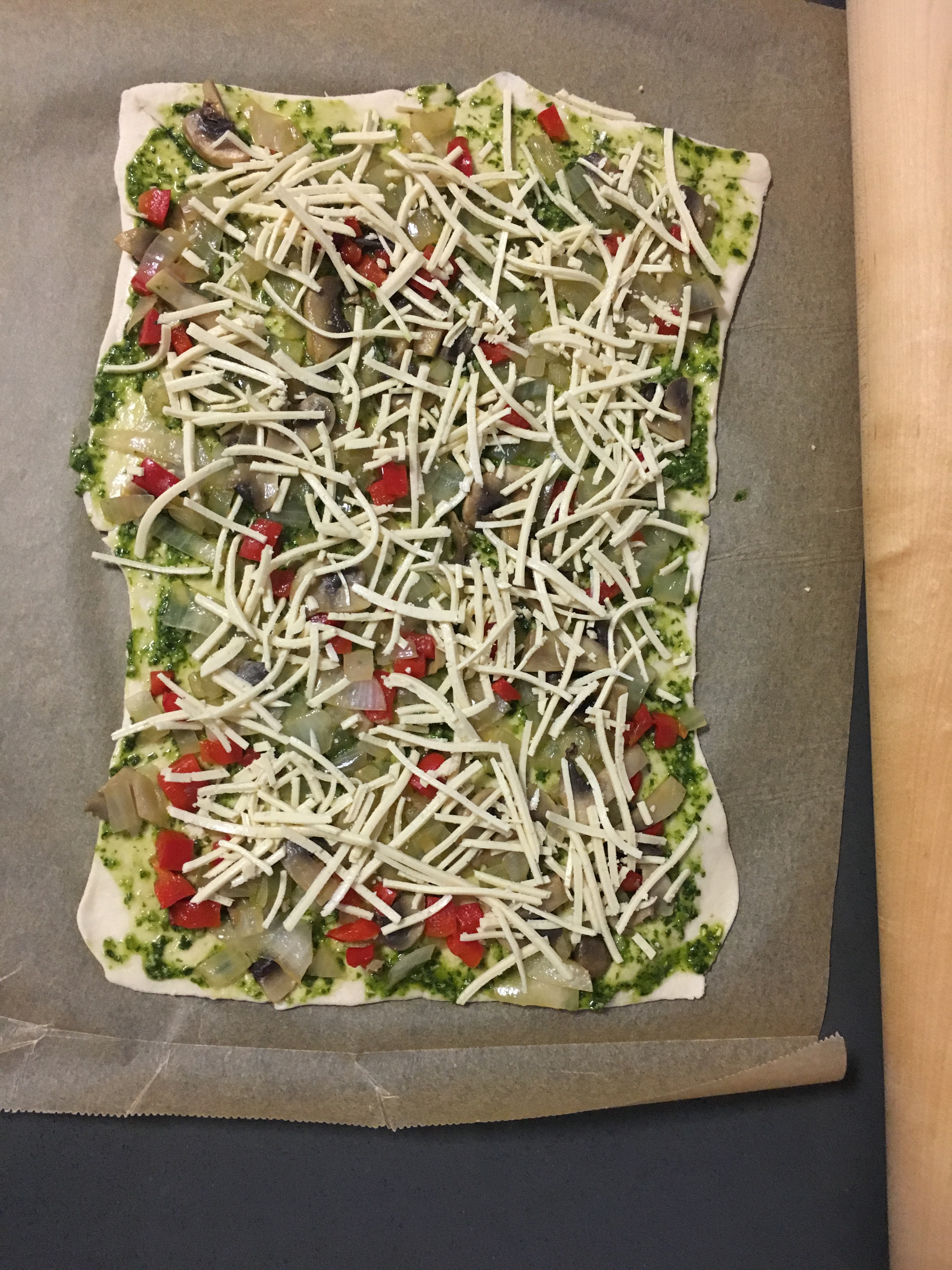 Start by sautéing the onion, bell pepper, and mushrooms in olive oil. Sauté on medium heat until soft, about 5 to 7 minutes. Let cool. Take the first roll and open onto parchment or wax paper. This will let the dough be more easily removed later. With your fingers, mash together all the seams to make one sheet of dough. Using a rolling pin (or label-free and cleaned wine bottle), roll out the dough a couple times in each direction to flatten and even everything.
