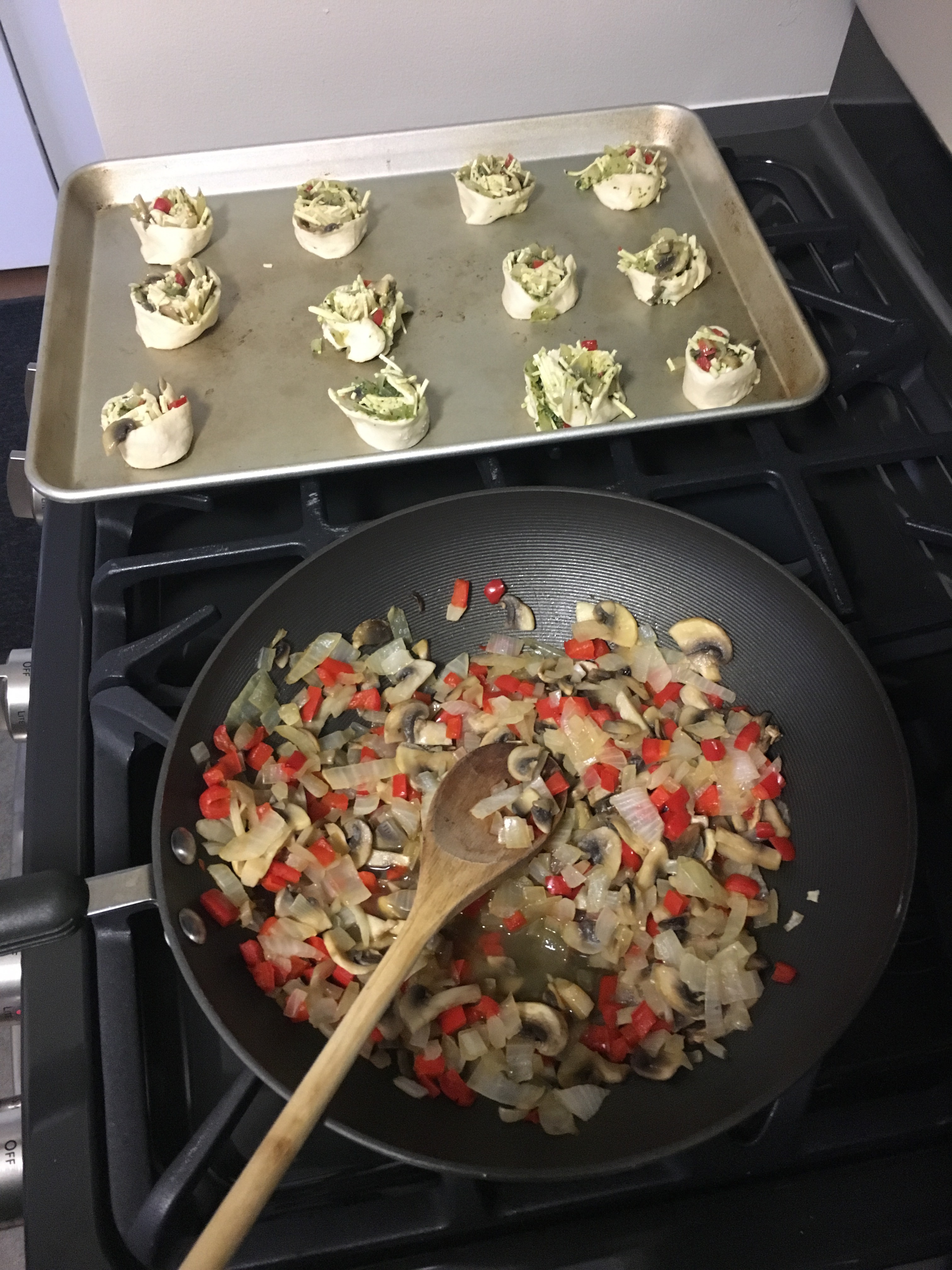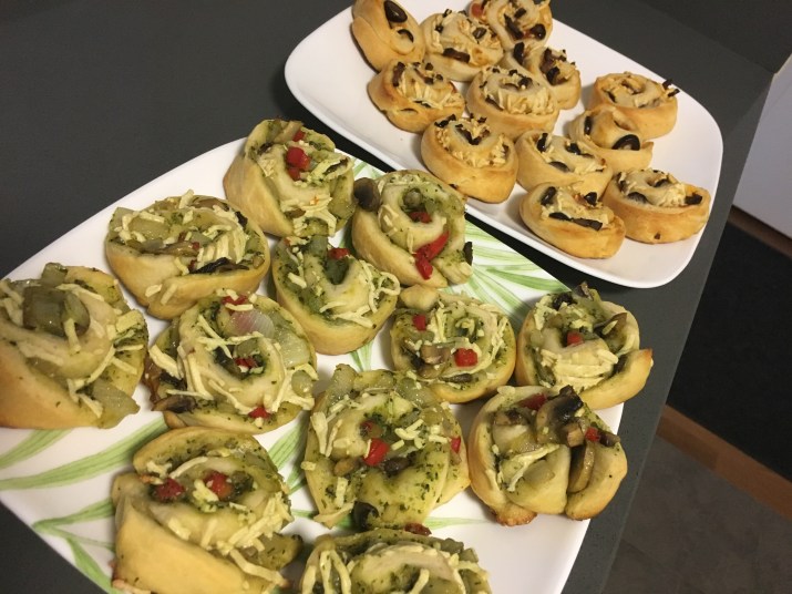 For the pesto bites: Use a spoon to add a thin layer of pesto to the dough, then a thin layer of the cooked veggies, and a thin layer of cheese. There will be left over filling. The layers should be thin because the dough is delicate and won’t roll well if too thick.