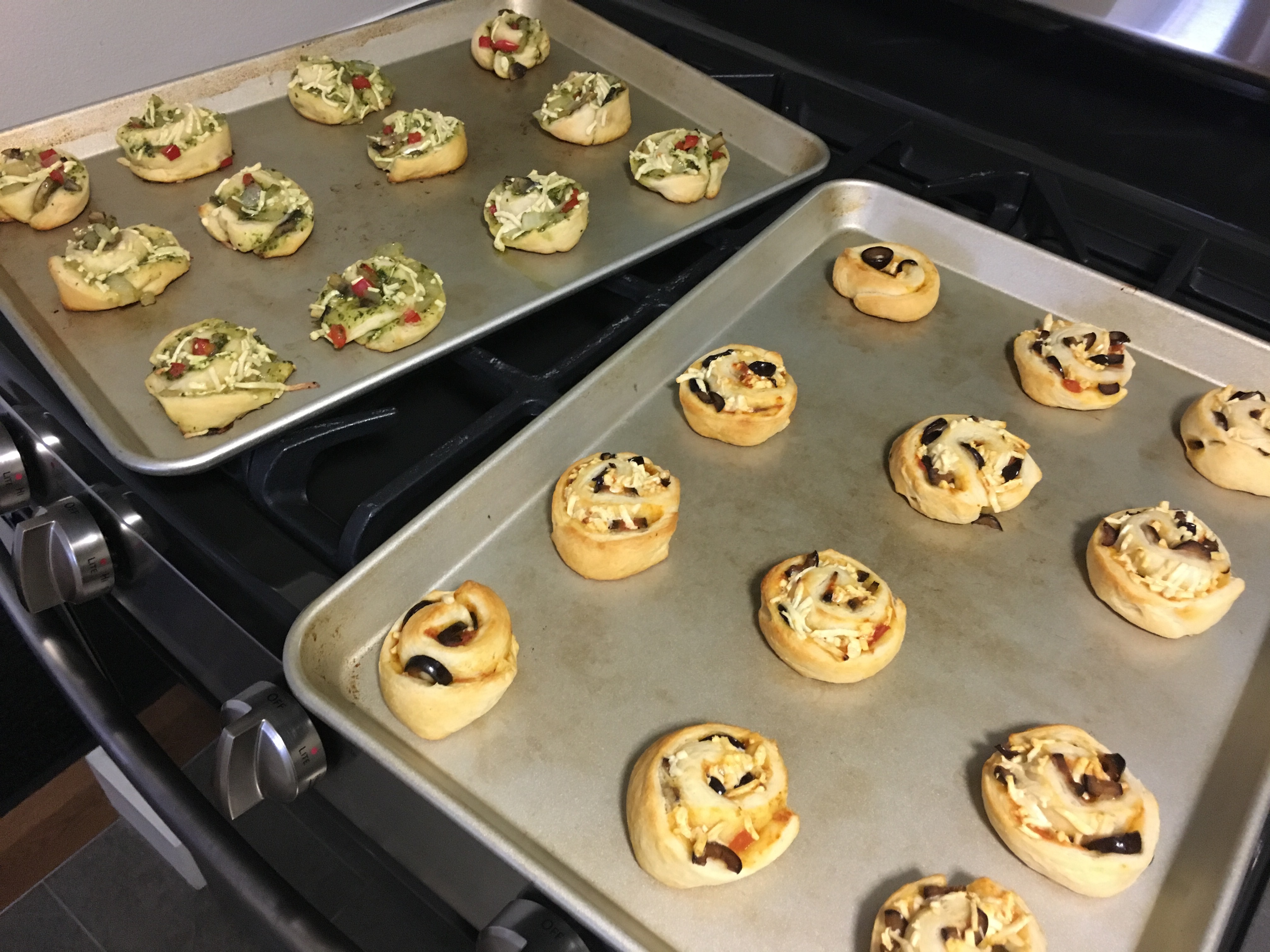 For the pizza bites: Follow the same dough preparation process of making into sheet. Add a thin layer of speghetti sauce, a thin layer of black olives, and a thin layer of cheese. Follow the same roll and cut process.