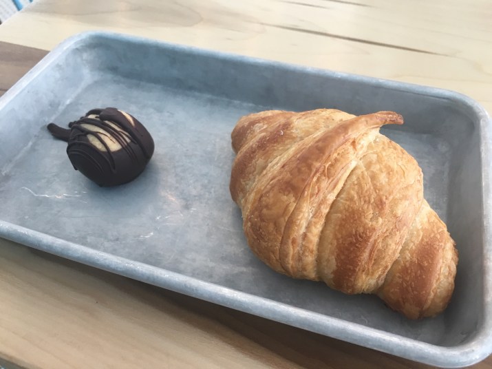 A coffee/tea house with pastries and chocolates. Several vegan items are clearly labeled. I picked out a croissant and peanut butter buckeye.