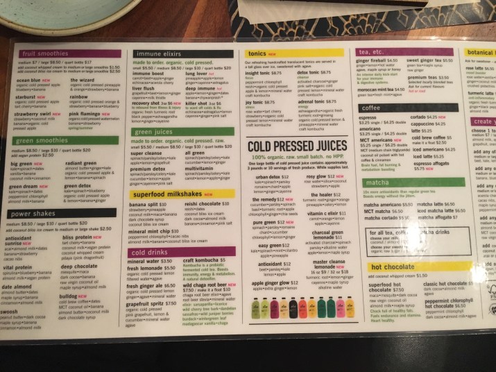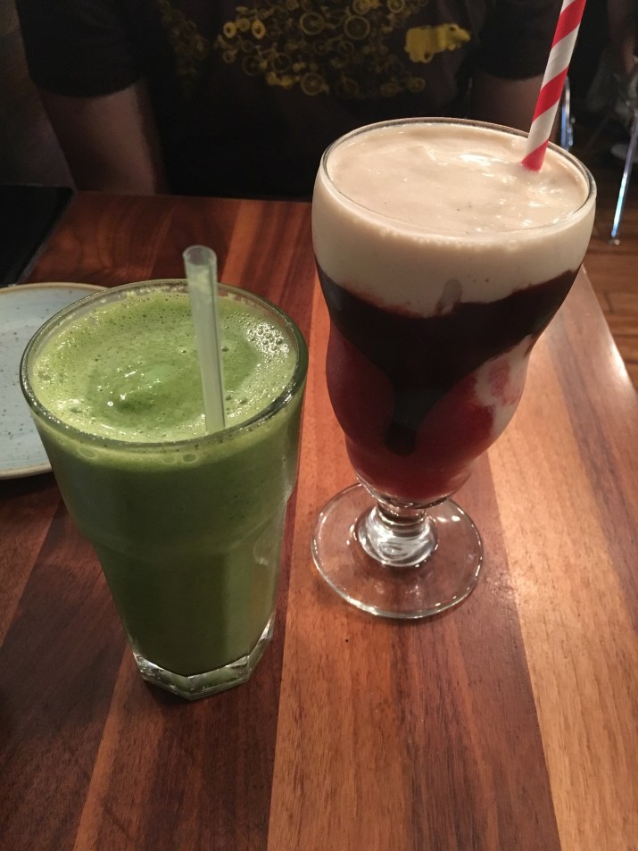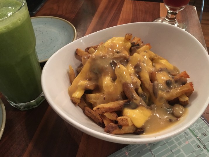 Upon sitting we were warned that the kitchen was about 35 minutes behind except for starters and smoothies. So we started with that. In Canada, do as Canadians do and order yourself some poutine! It’s fries with cheese curds and gravy. The legend we were told is that someone was carrying all these ingredients separately and dropped them only to find they were delicious together. Sounds like something I would do! We ordered the green poutine and I got a radiant smoothie. Hubby got a banana split milkshake.