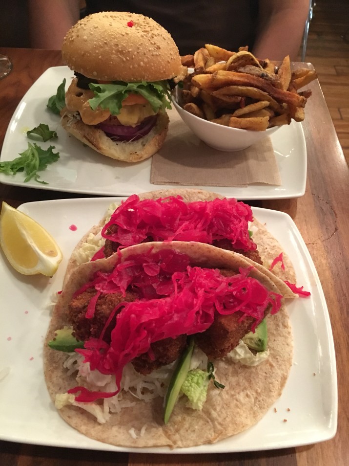 Yummers! The vegan version of poutine works for me! The menu is a bit overwhelming, so I asked our server what was popular and landed on the crispy cauliflower tacos. Hubby picked out the Beyond Meat cheeseburger, as usual. He’s so happy to be eating cheeseburgers again.
