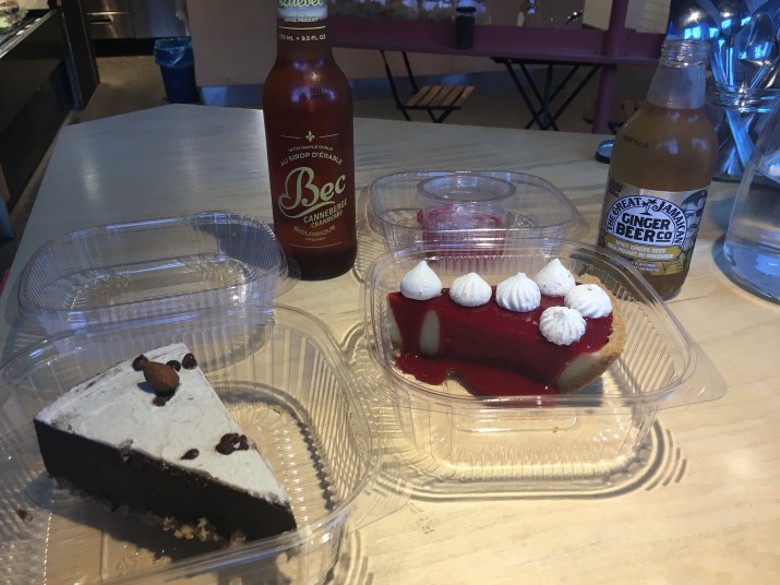 The menu includes things like poutine and quesadillas, but we headed straight for the dessert case and picked out a slice of lemon custard pie with meringue and raspberry sauce and a slice of chocolate and banana cream pie. Yummers!