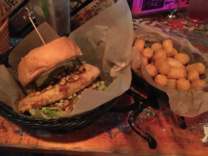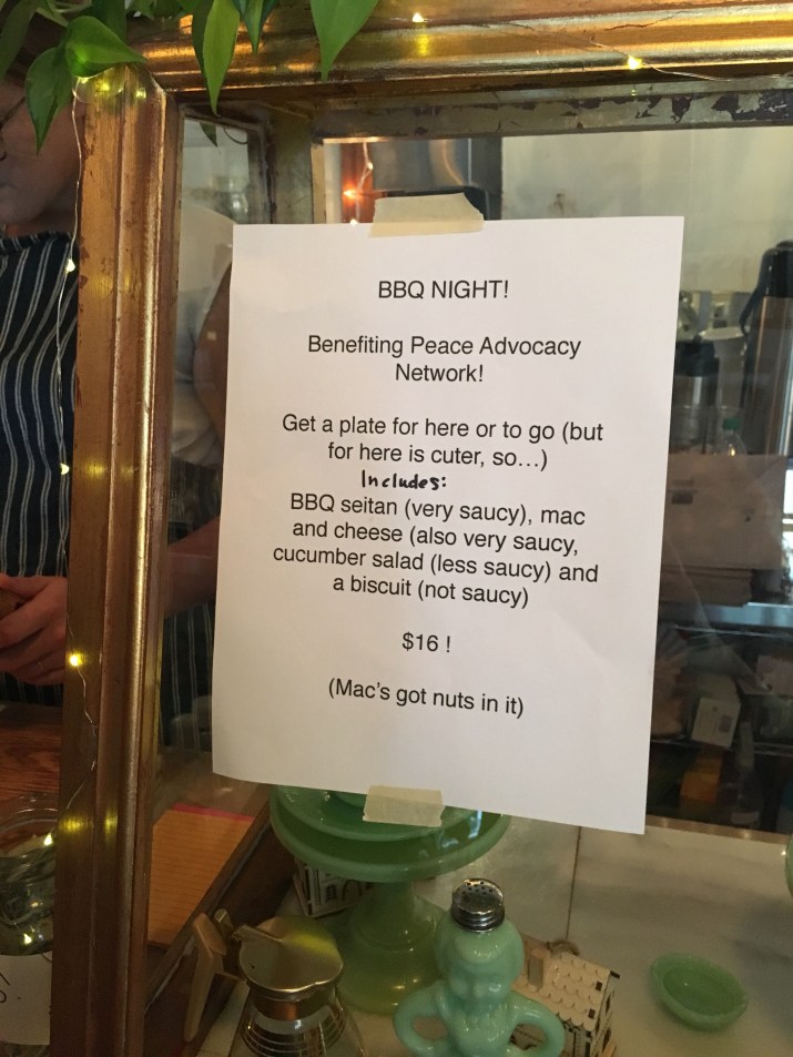 The first night I participated was Monday and it was the kickoff event at Tattooed Mom’s. Luckily we arrived at 6:00 to eat before a vegan bake sale because they ran out of the special sandwich! A picnic fried chick’n sammy.