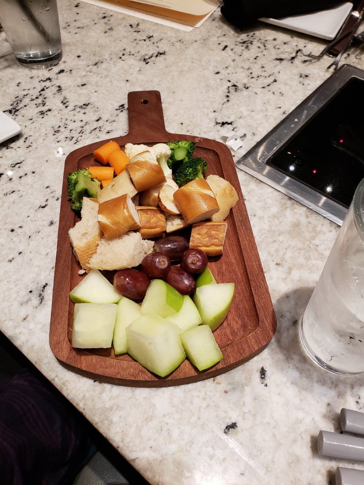 Everyone got a tray of bread, fruit, and vegetables to dip in the fondue.