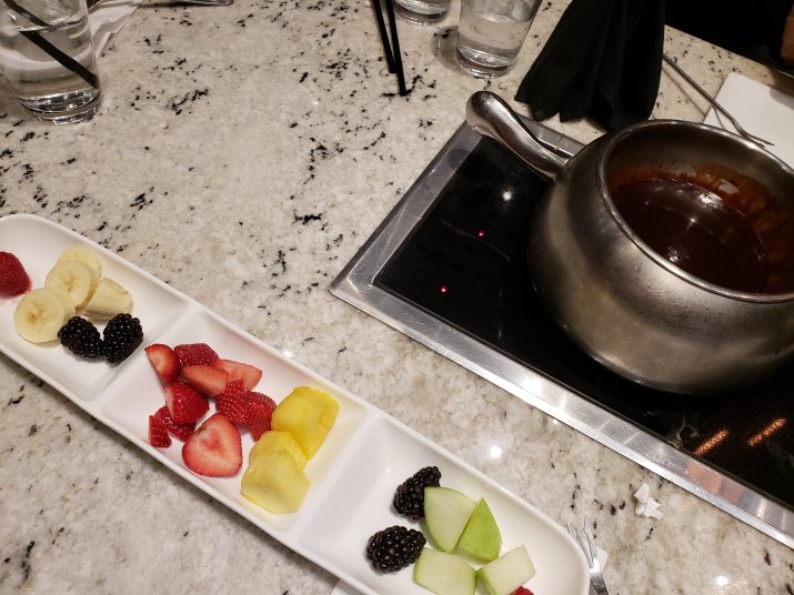 After what seemed like an eternity to cook our own food, dessert came. Melted chocolate and a plate of fruit.