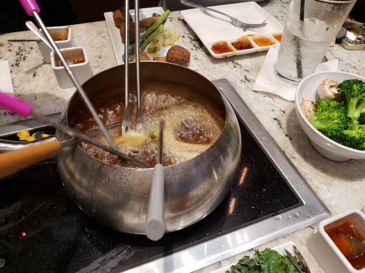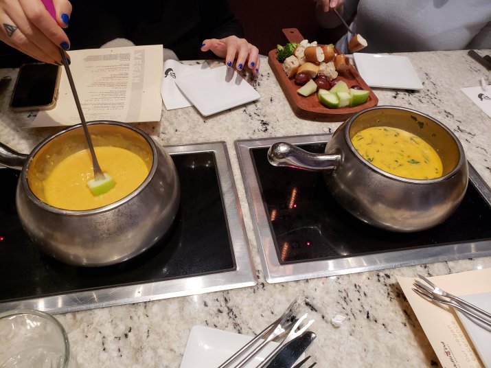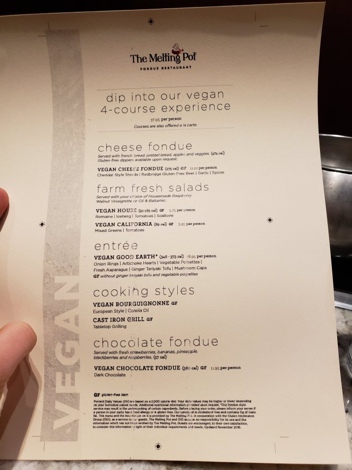 The Melting Pot is a chain of fondue restaurants. From what I understand, they have always had veganizable options, but at some locations they currently have a separate vegan menu. A group of vegan friends and I decided we had to try out the special menu.