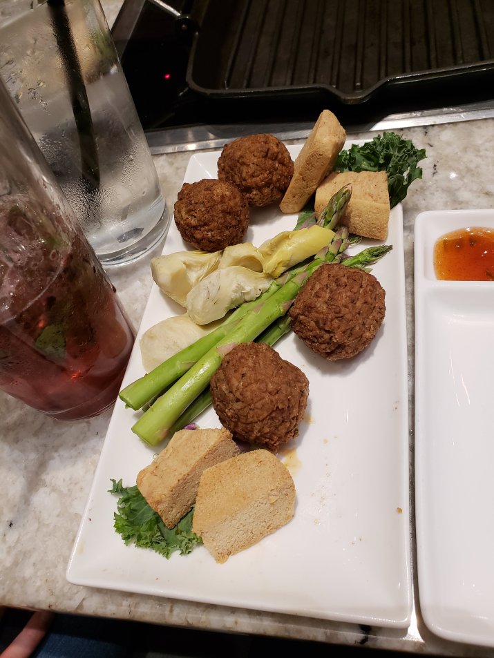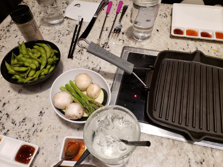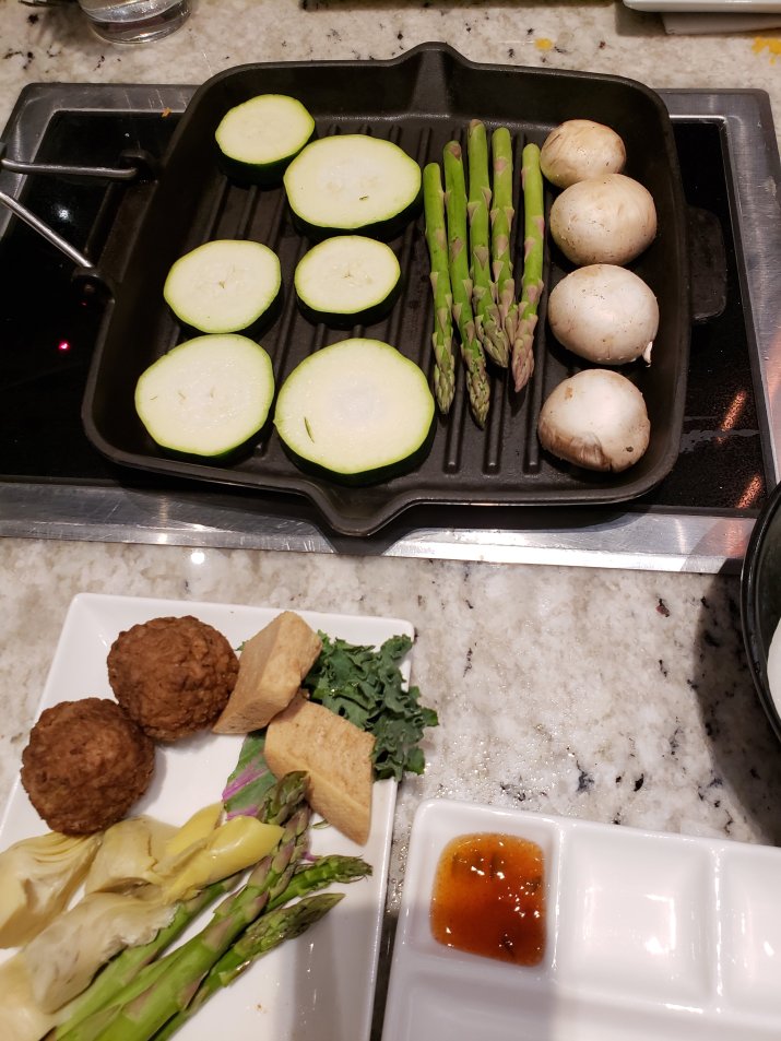 The most challenging part of the meal was the main course. Trays of vegetables, tofu, and faux meatballs came to the table and we each got to grill or fry our own vegetables.