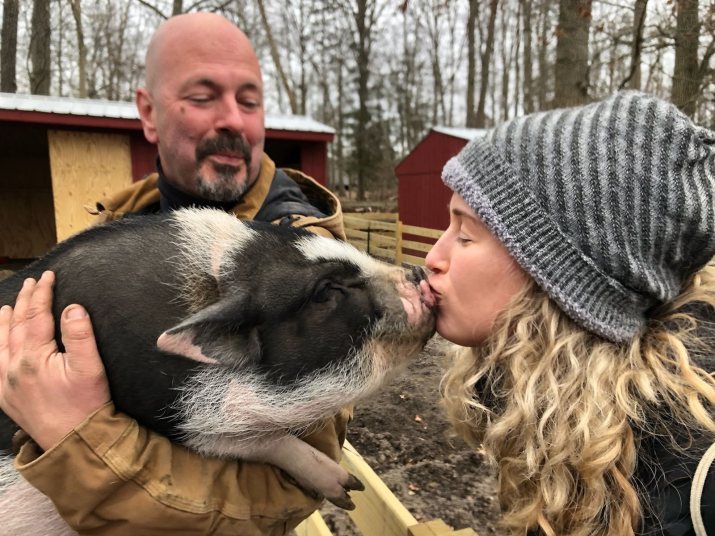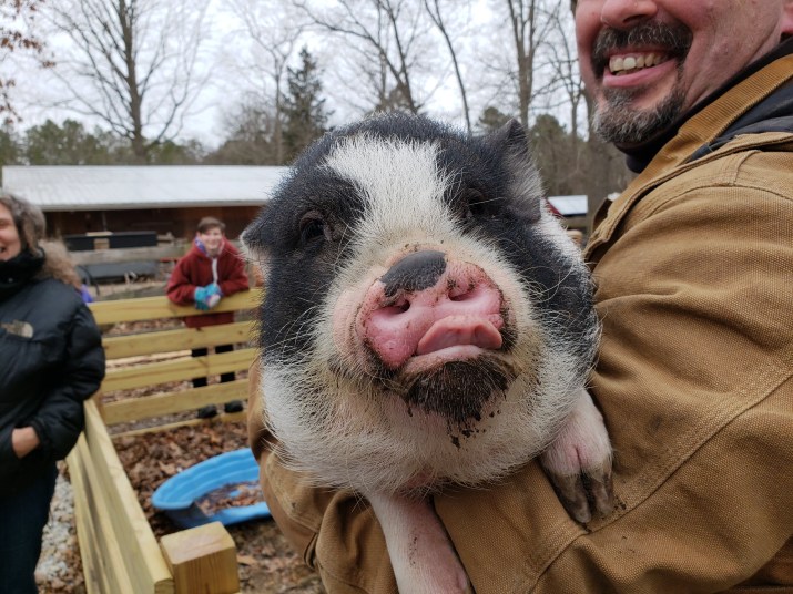 Then we stepped into a wonderland of animals! Laurie, the founder of Funny Farm, and Robin, a long-time volunteer, took us to meet all the animals and learn their stories. Stories of cows intended to be slaughtered for food, but families realizing they could not eat such loving animals. Stories of pigs that were house pets until their humans realized they would become too big for their home. There is no such thing as a small pig. Even pot-bellied pigs are too big for urban and suburban homes.