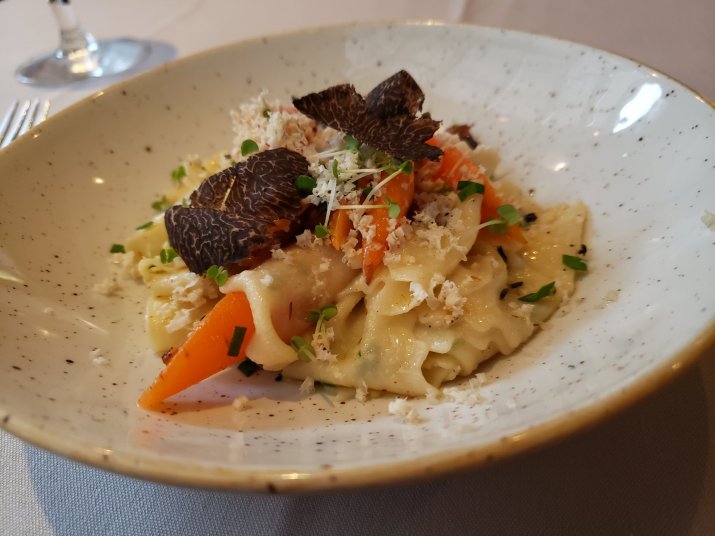 We both really liked the flavors and textures. Next came pappardelle with black truffles. Black truffles are the cat’s meow and we were excited to try this.