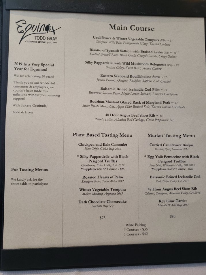 We were disappointed with the dinner. Equinox gets three out of five vegan cupcakes. The service was great and hubby enjoyed the wines that were paired with each course. The birthday card was such a lovely touch. But the food could be better, especially for the price point.