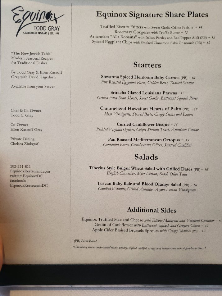 We just returned from Washington DC and ate our way through the city, of course. One night we had a fancy dinner at Equinox Restaurant. This place has rave reviews online from vegans. It is not a fully vegan restaurant, but the options are clearly labeled on the menu as PB (plant based). Instead of trying to decided what to get, we went for the vegan tasting menu.