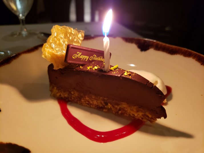 The final course was a dark chocolate cheesecake. Since we were celebrating a birthday, hubby got a candle in his AND a birthday card! We thought that was really sweet.